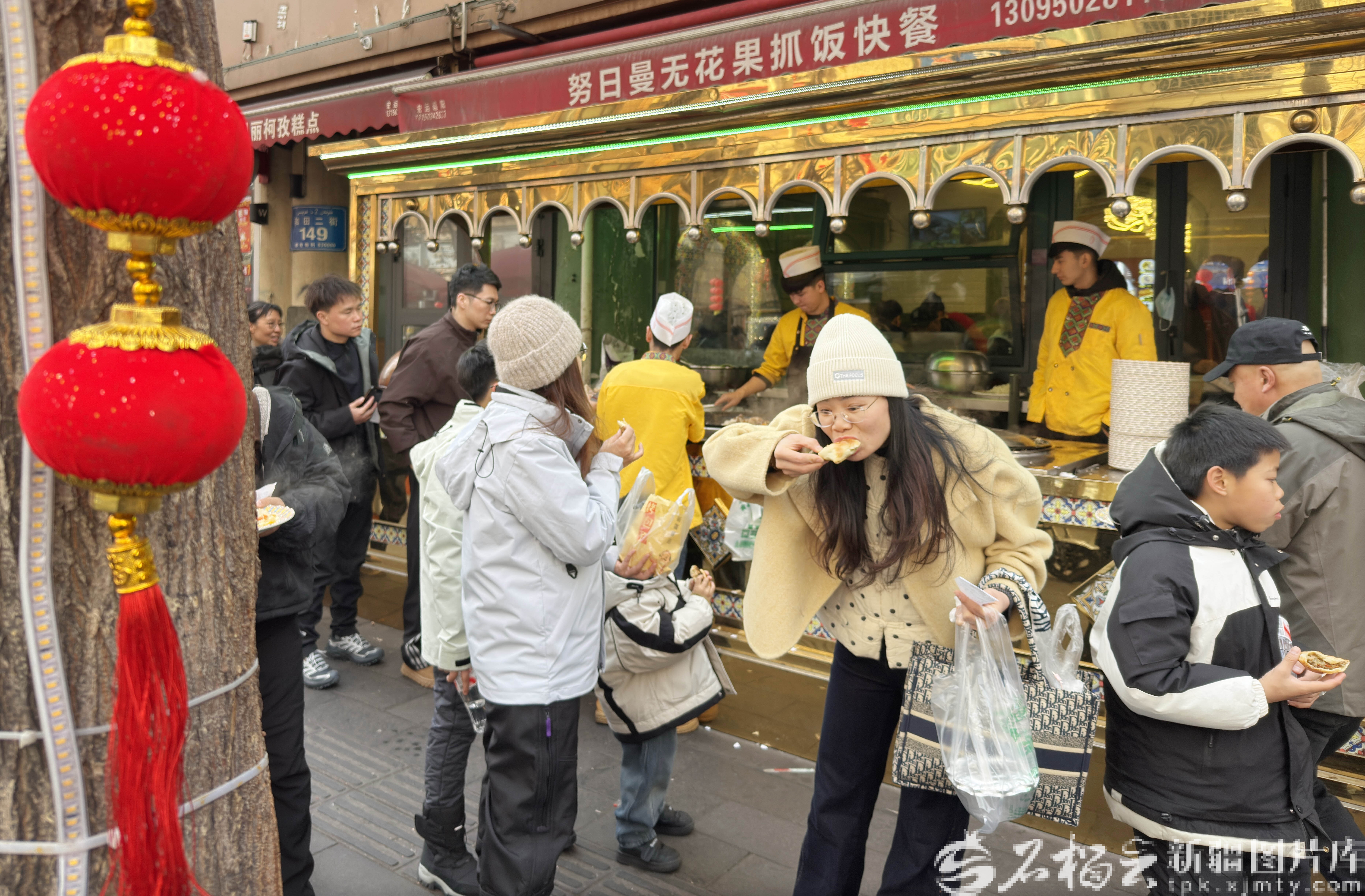 2月23日,游客在乌鲁木齐市和田二街品尝美食。