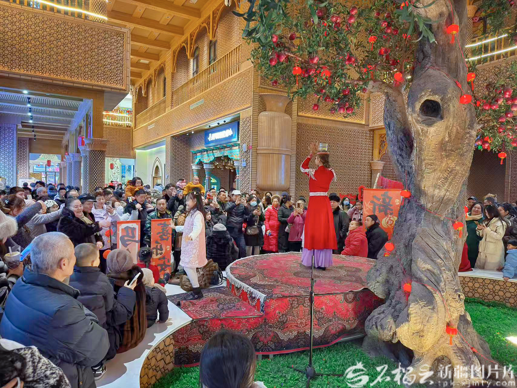2月23日,演员在乌鲁木齐大巴扎步行街二期·疆来城非遗展演区为游客表演歌舞。