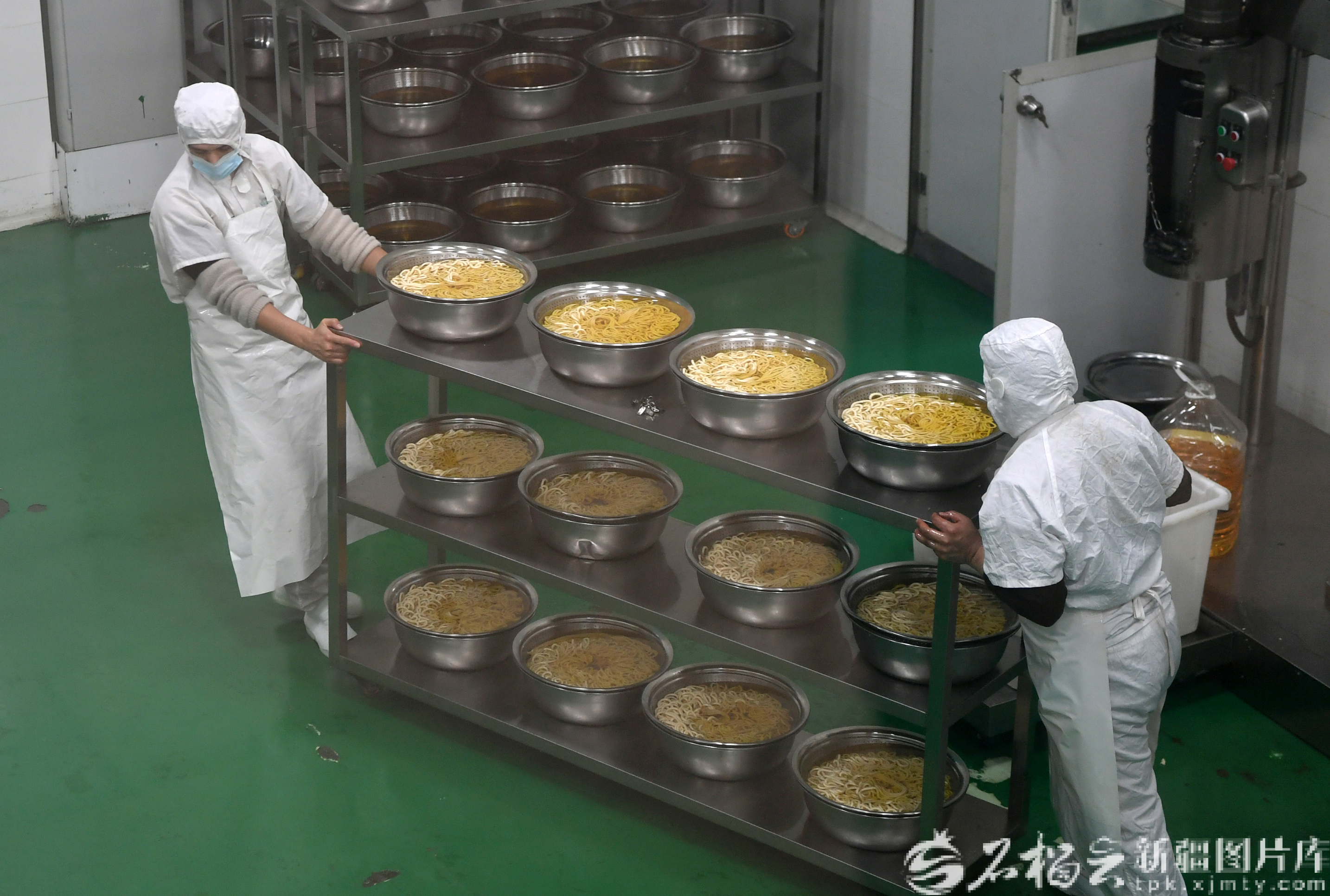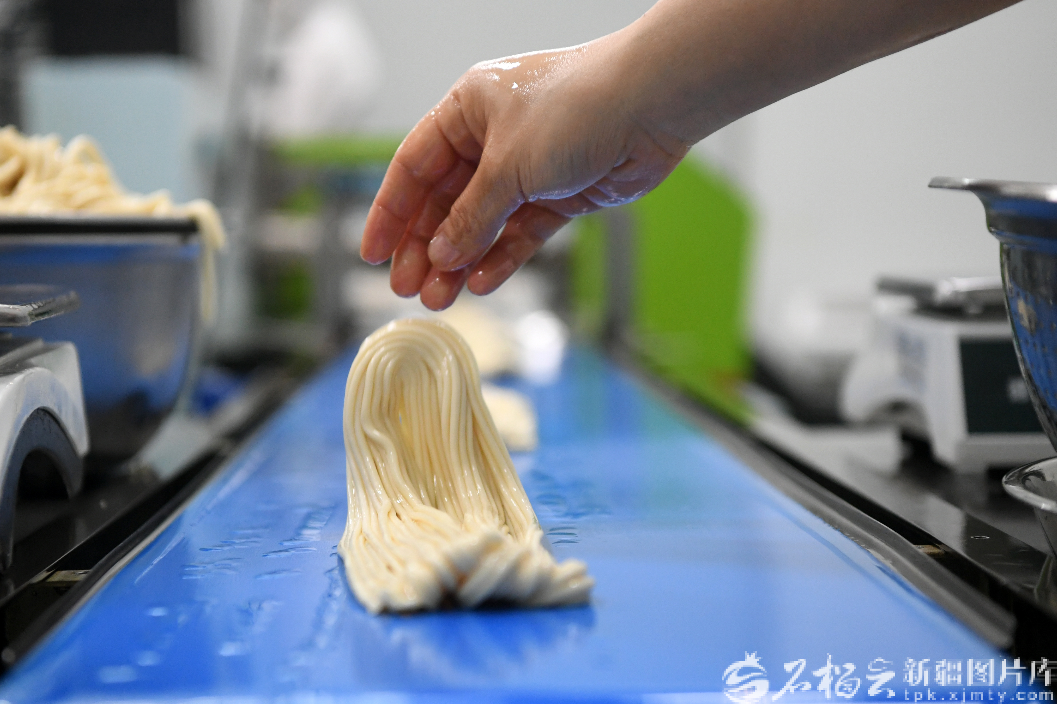 2月25日,新疆穆膳佰味食品有限公司生产车间里,工人把冰鲜拉面放在流水线上。
