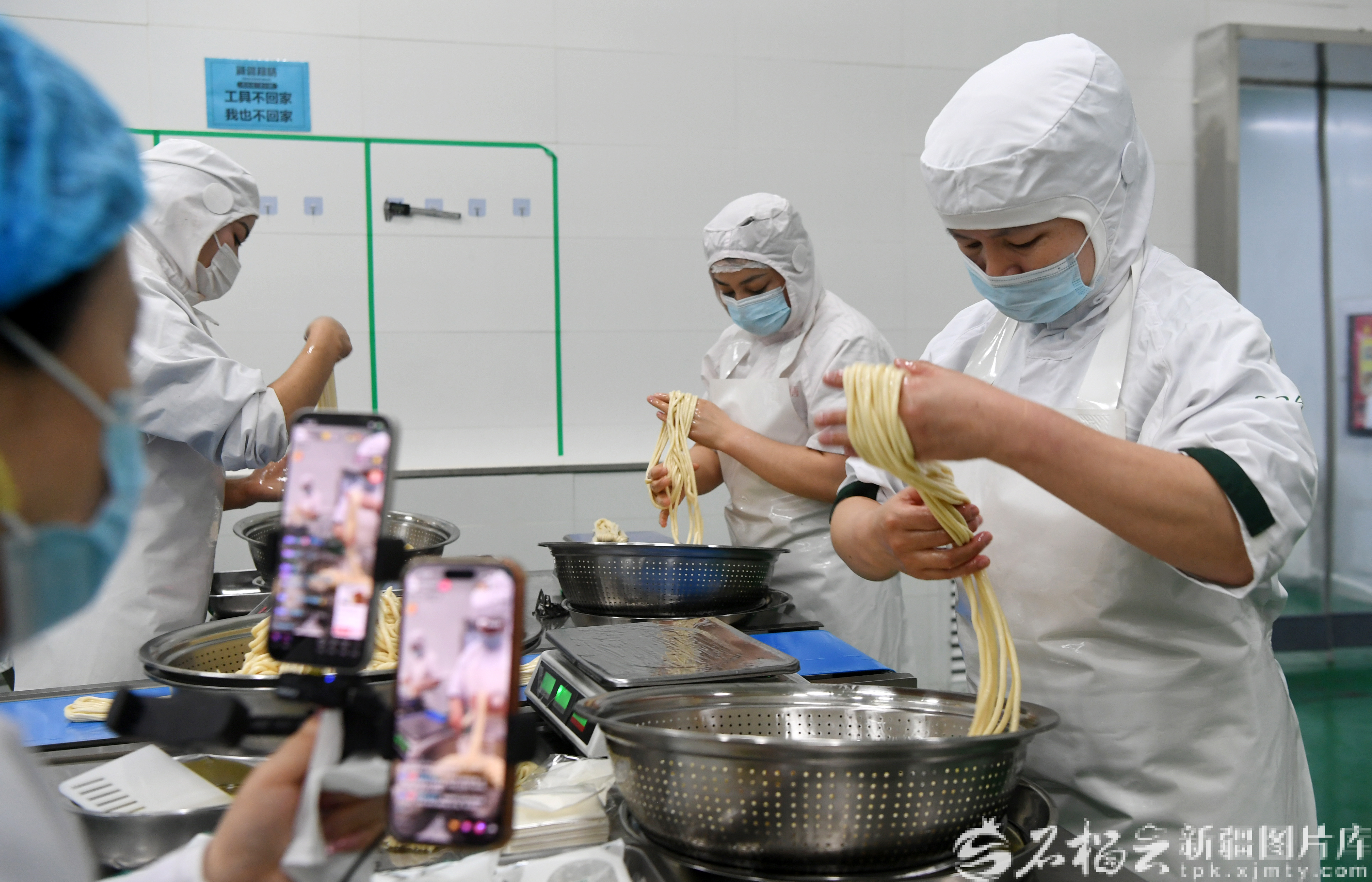 2月25日,新疆穆膳佰味食品有限公司生产车间里,员工在直播冰鲜拉面制作过程。