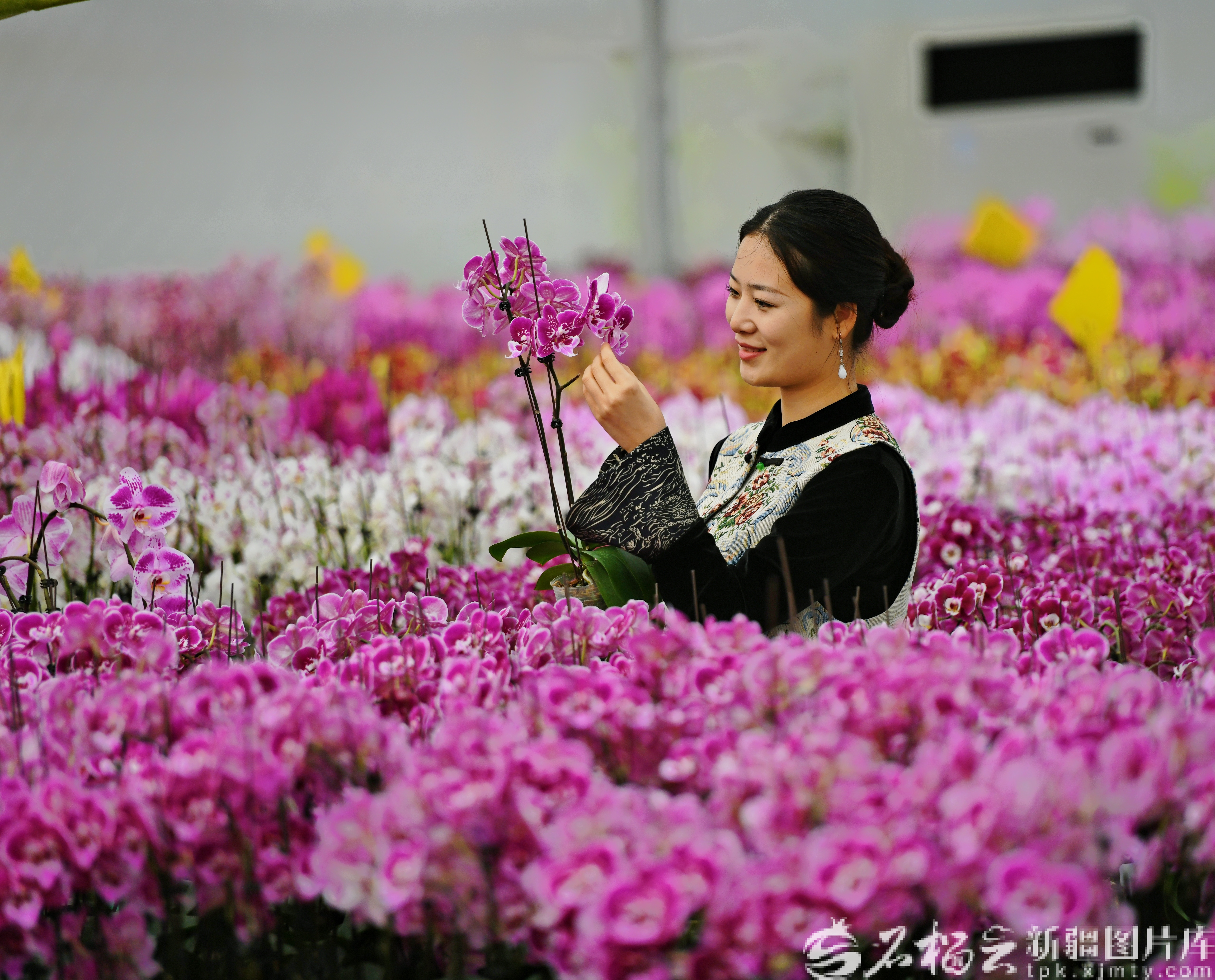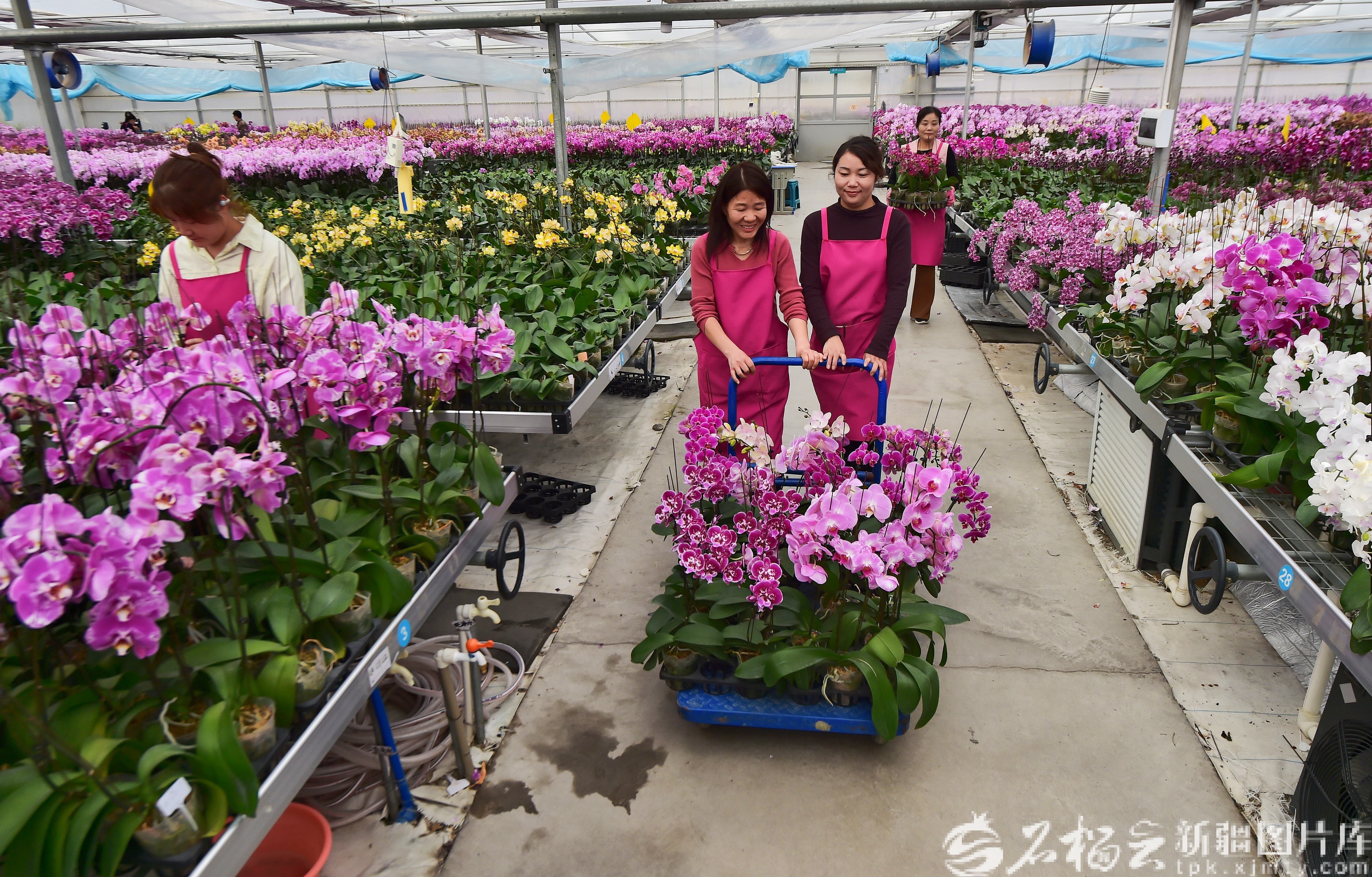 2月25日,新疆万瑞丰花卉基地智能温室里,员工在搬运蝴蝶兰。