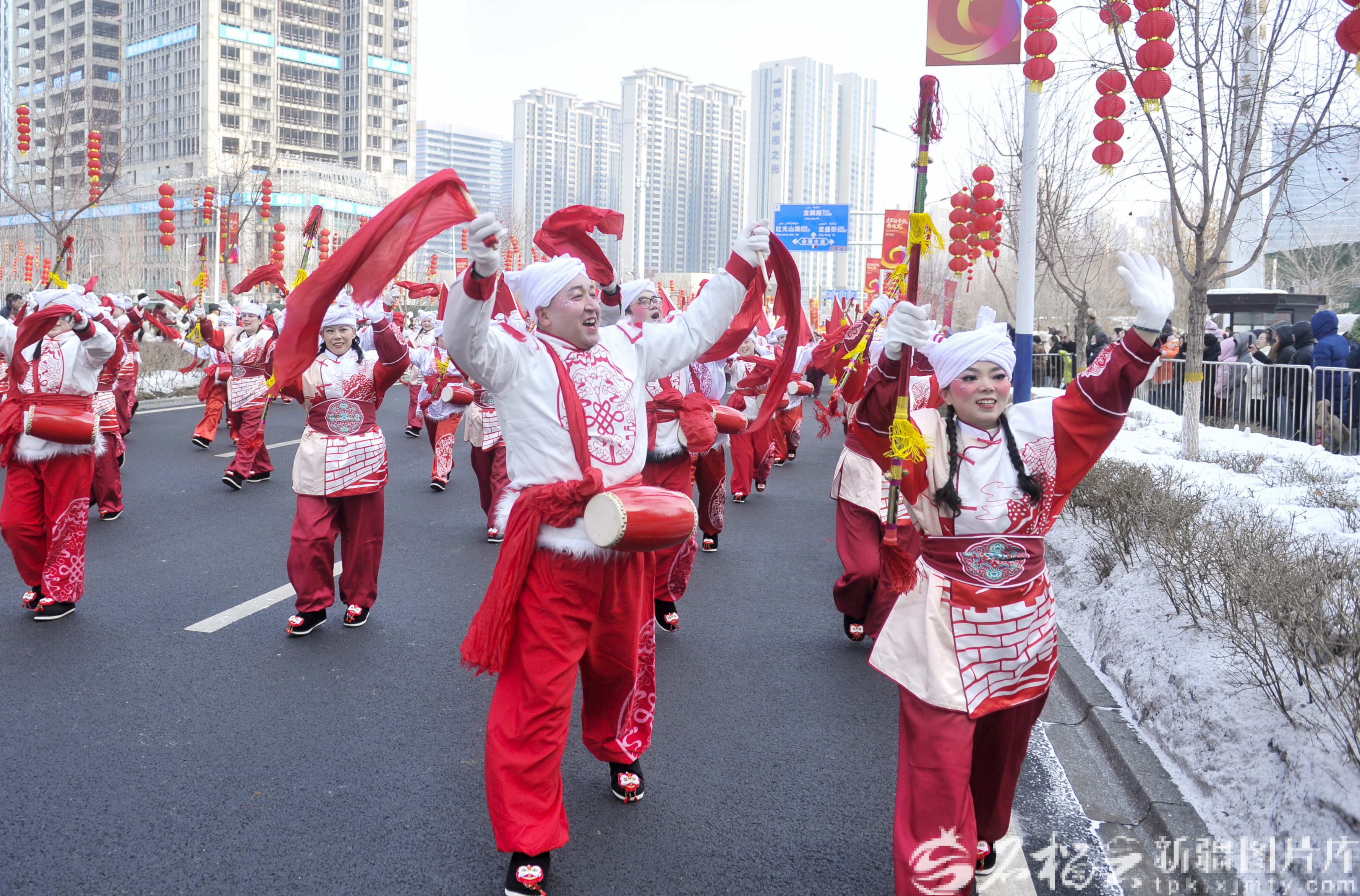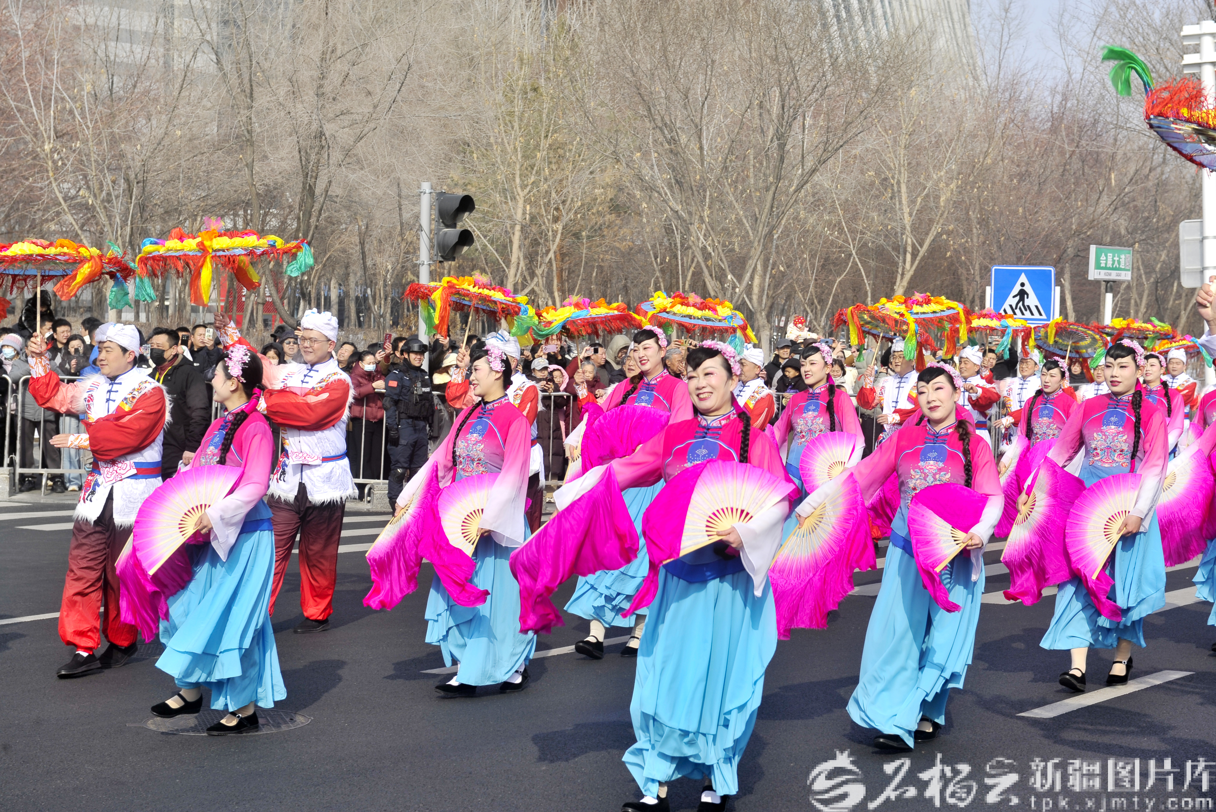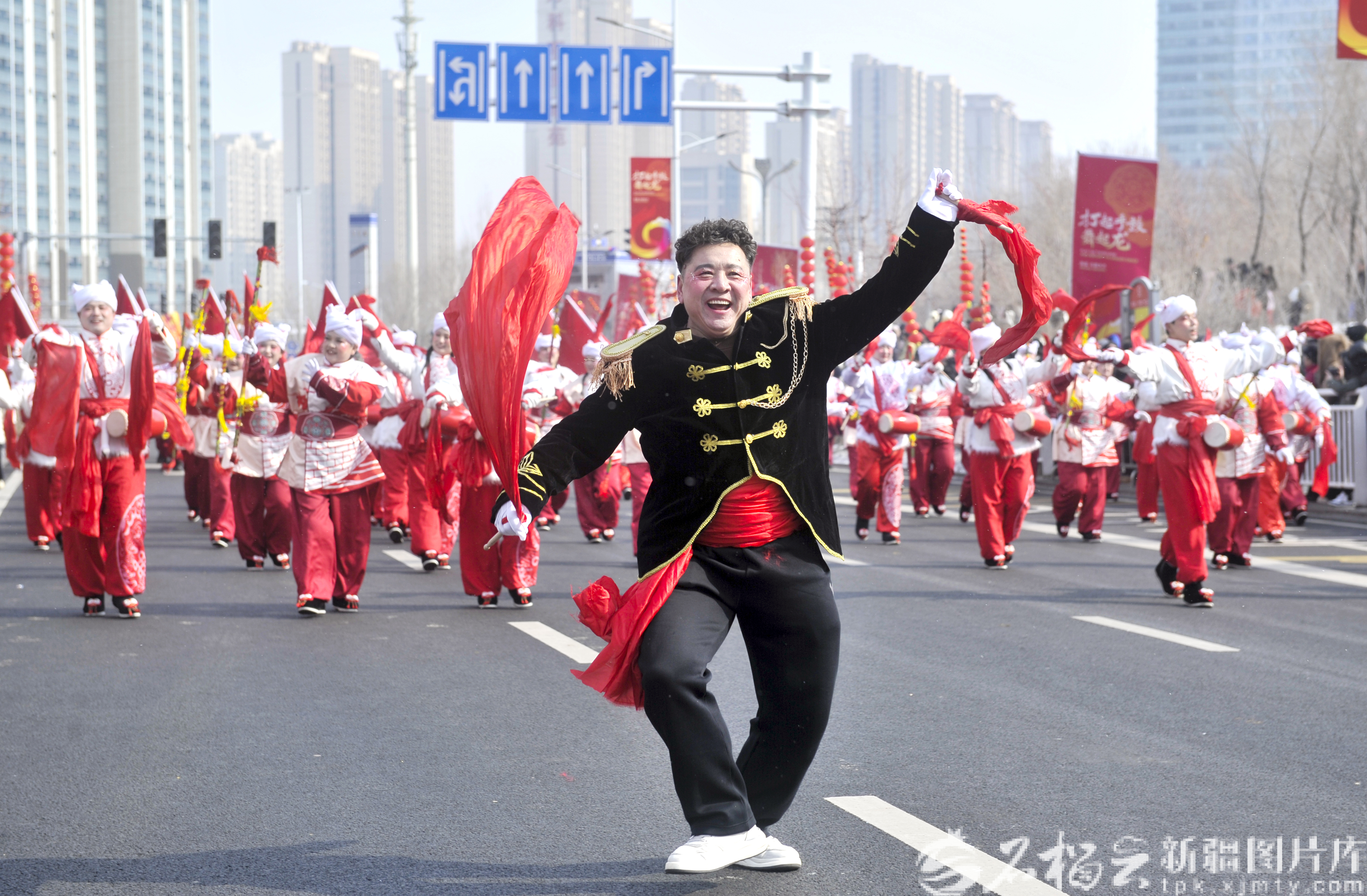 2月26日,来自新疆生产建设兵团第十三师的秧歌队在表演社火。