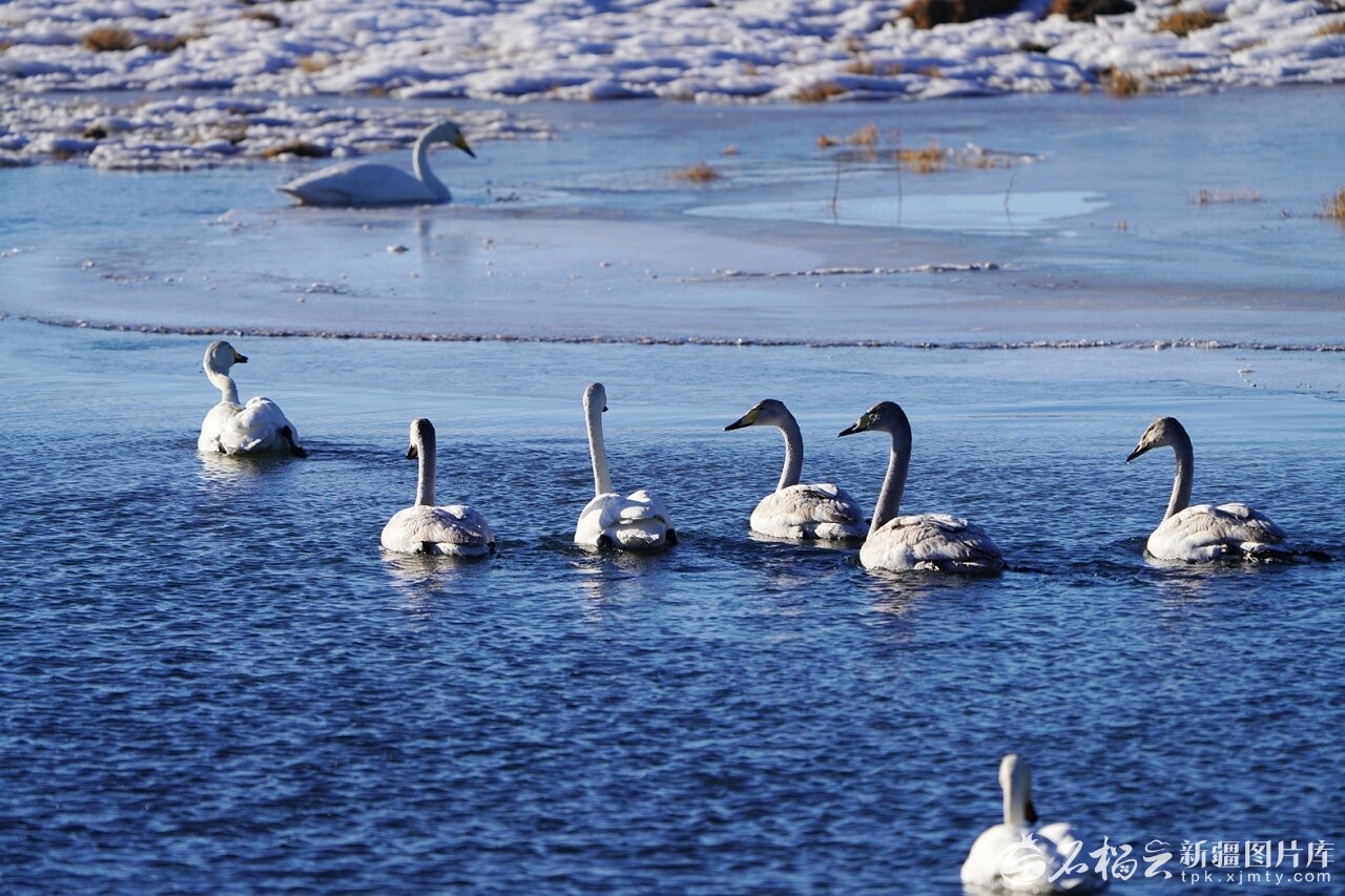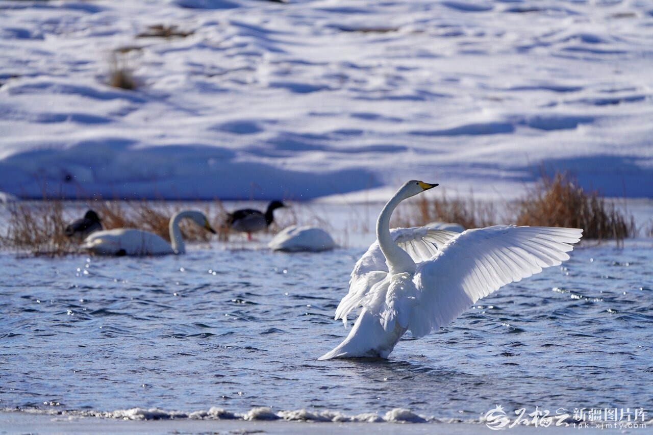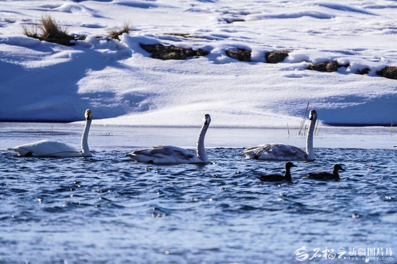 2026年2月22日,新疆哈密市巴里坤哈萨克自治县高家湖温地河流中畅游觅食的大天鹅。高家湖湿地位于东天山脚下,由于当地生态保护与合理开发,成为当地4A景区,现高家湖湿地河流中鱼虾成群,已成为大天鹅、蓑羽鹤、白鹭等鸟类的四季繁衍栖息地。