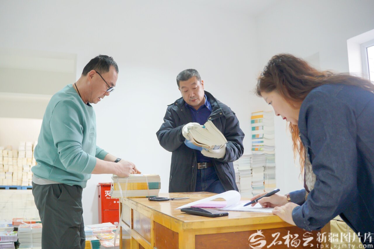 2月24日,昌吉新华书店配送中心,工作人员正在分发教材,全力保障“课前到书,人手一册” 。何龙摄