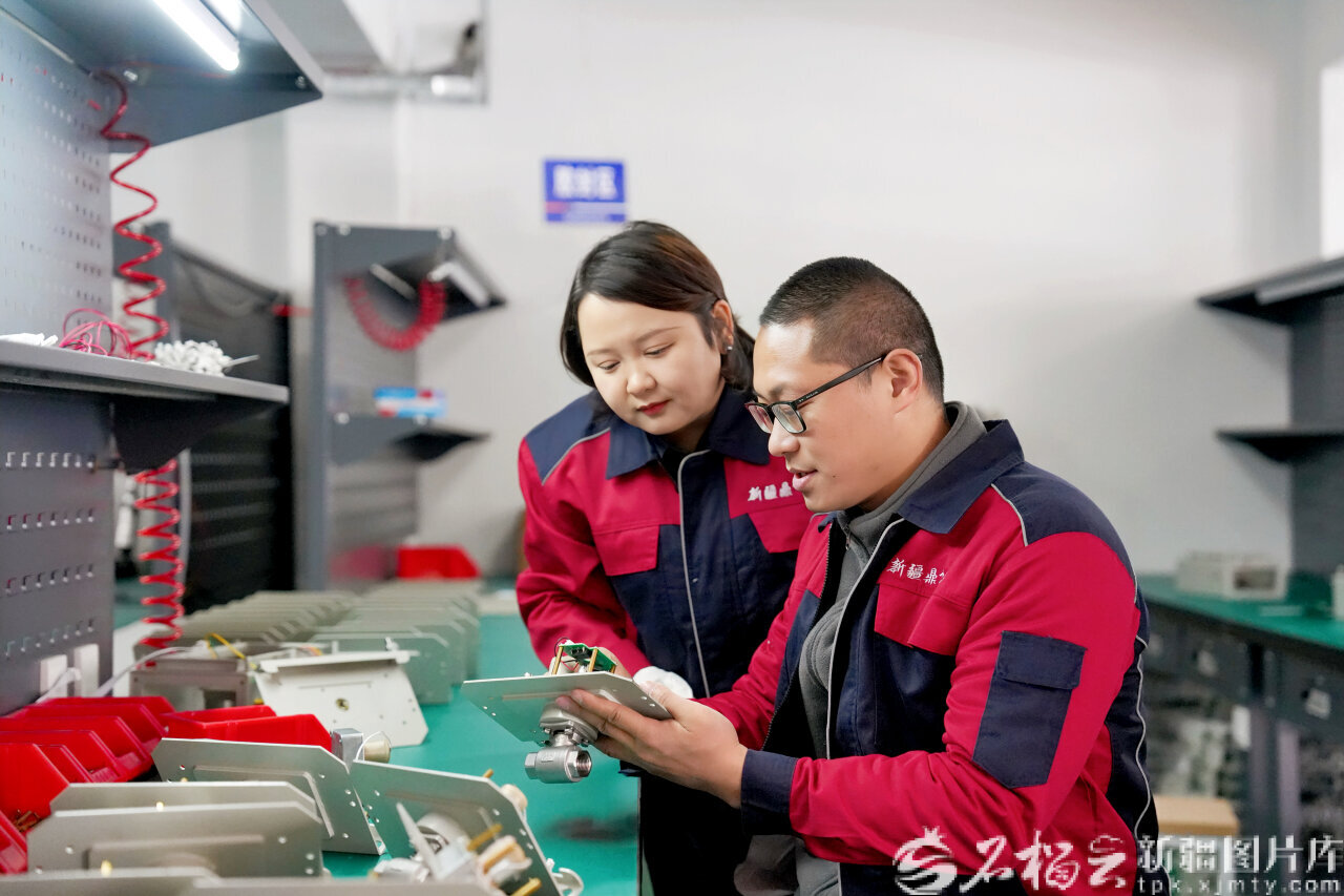 2月24日,在新疆鼎飞益智能科技有限公司,沙湾市柔性引进人才朱小龙博士(右)正在给员工示范矿用无线自动洒水降尘装置主机装配技巧,帮带本土人才。杨文秀摄