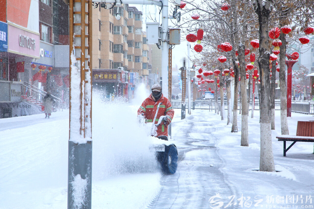 2月24日,环卫工人在五家渠市将军街步行街清理积雪,保障市民出行安全。魏新江摄