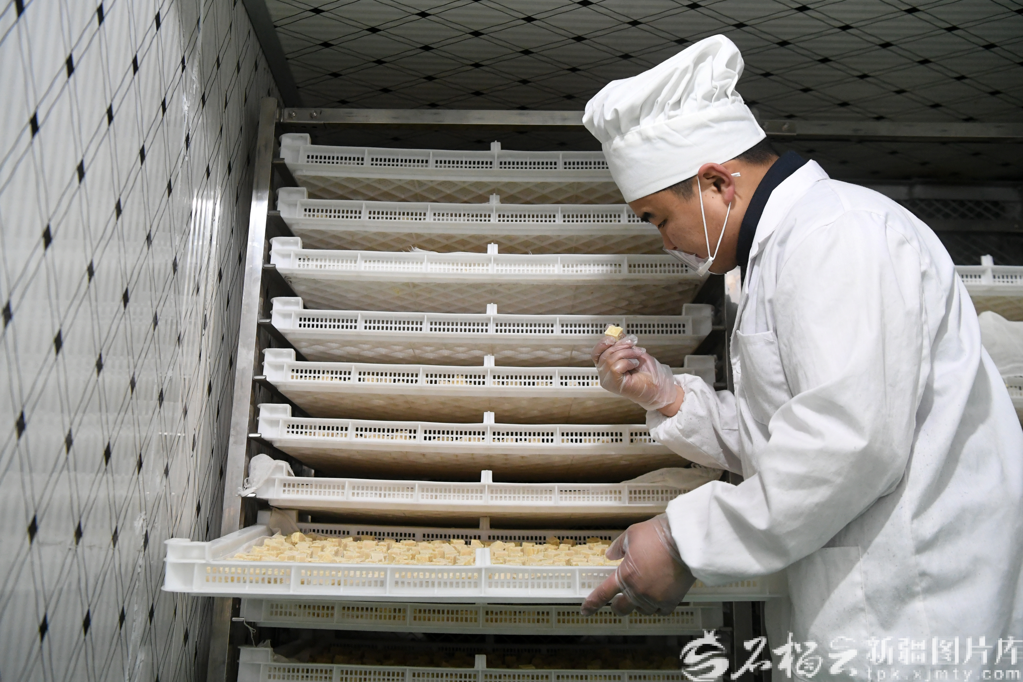2月27日,乌鲁木齐新牧醇奶制品有限公司的车间里,吐玛尔别克·赛里克哈孜(右)和工人在制作酸奶疙瘩。