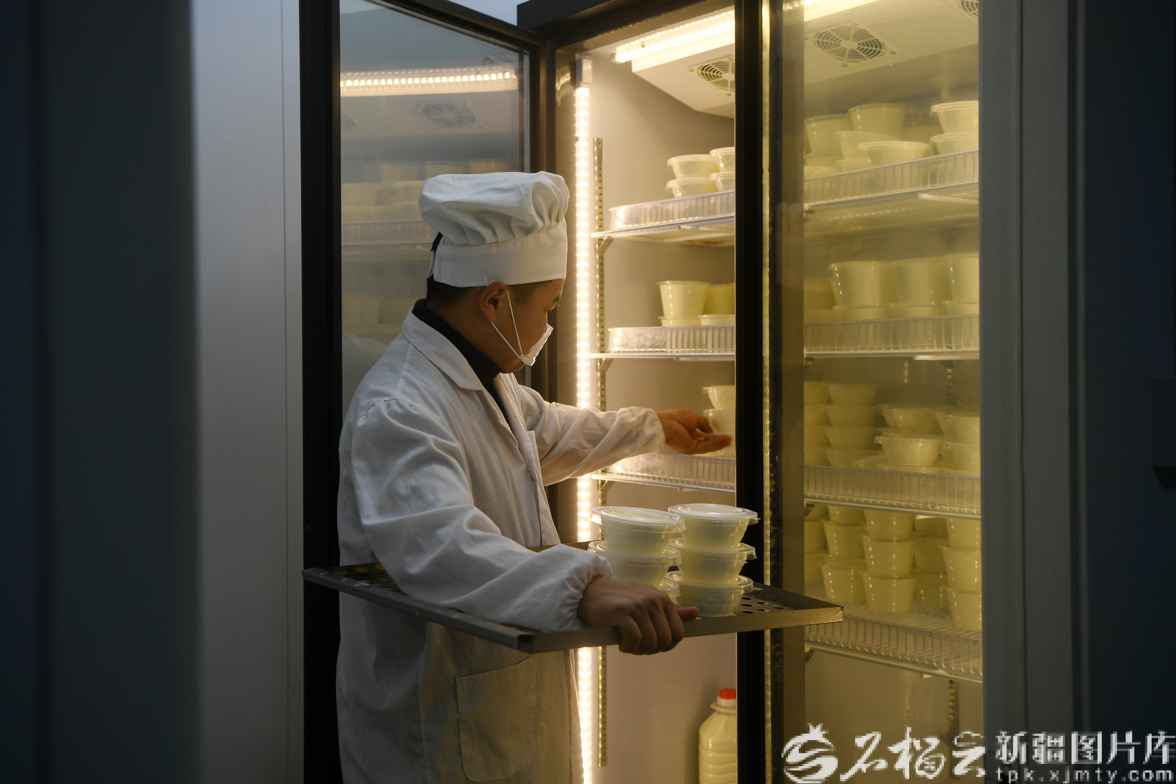 2月27日,吐玛尔别克·赛里克哈孜把制作好的酸奶放进冰柜。