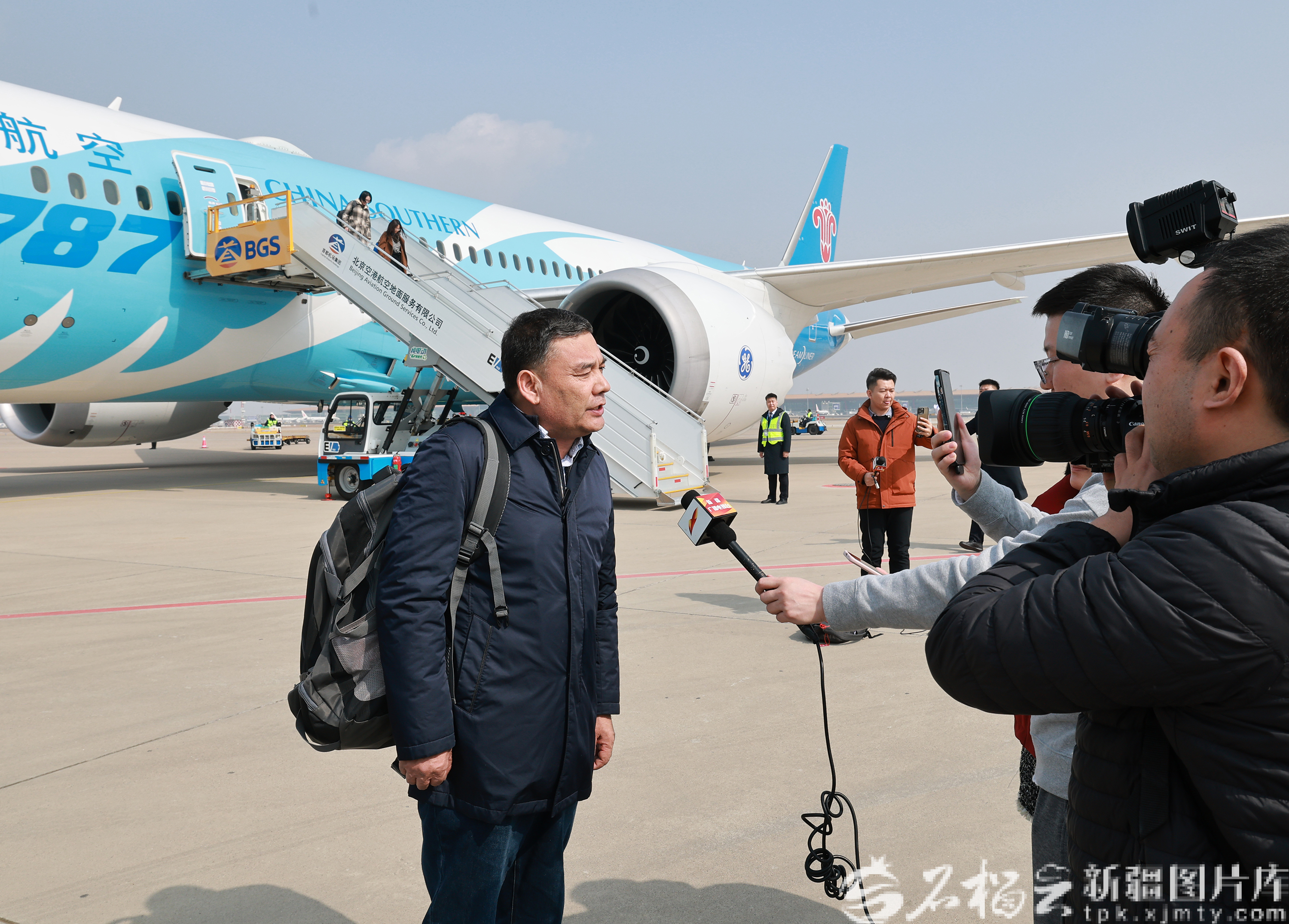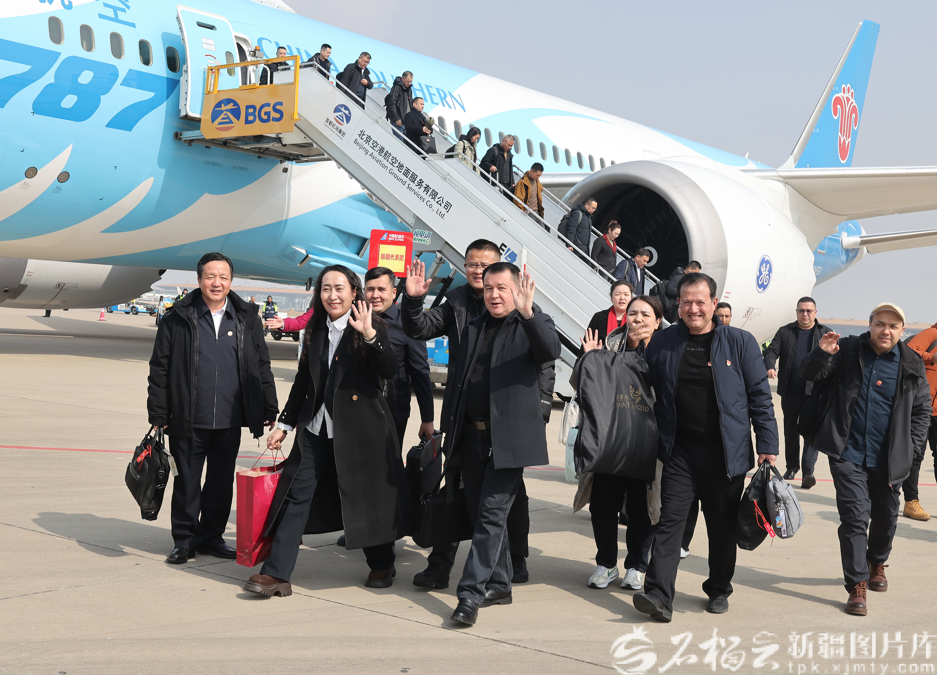 3月3日,出席十四届全国人大四次会议的在疆全国人大代表乘机抵达北京。石榴云/新疆日报记者 崔志坚摄