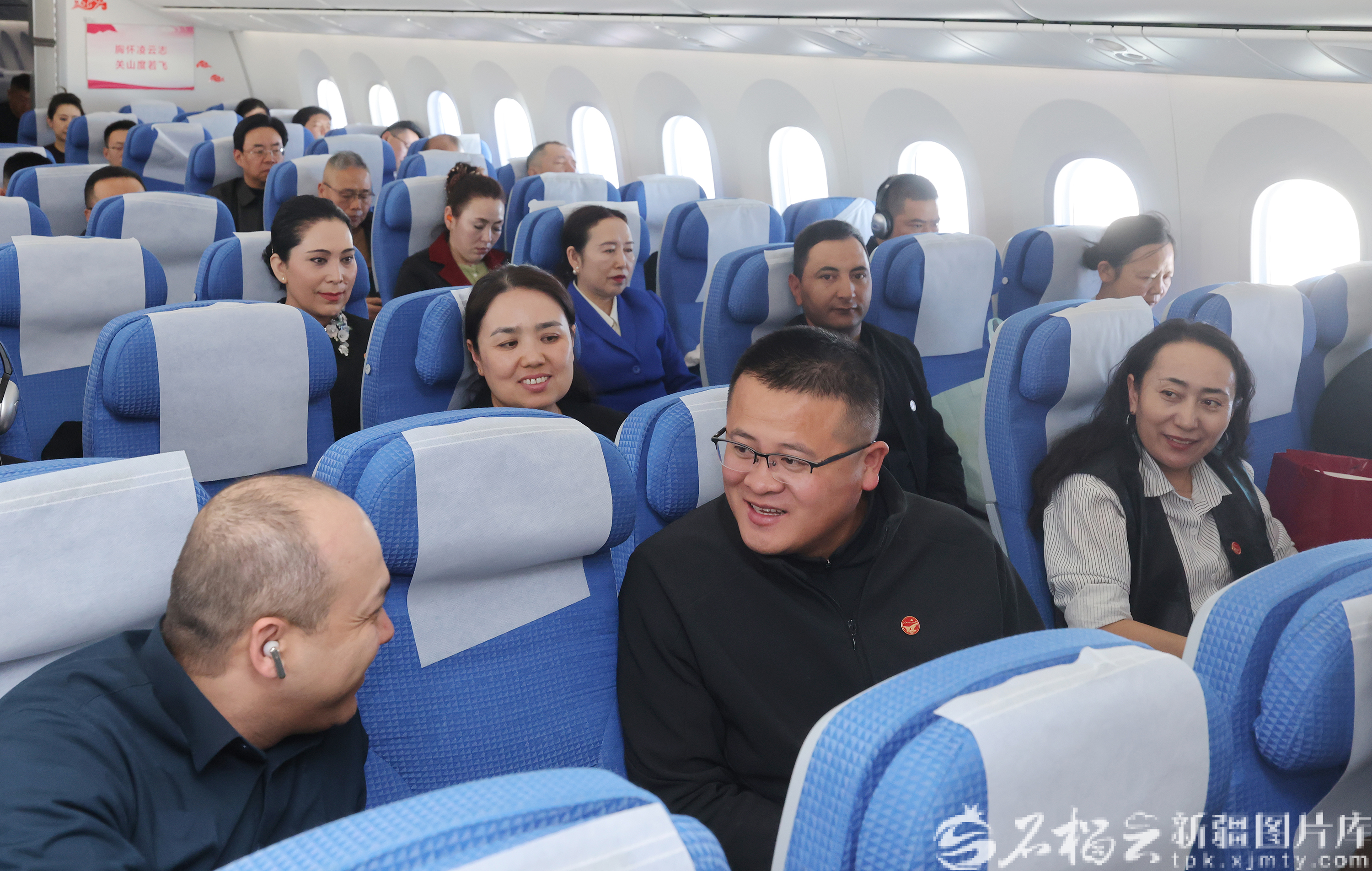 3月3日,出席十四届全国人大四次会议的在疆全国人大代表乘机抵达北京。图为在前往北京的飞机上,逄子剑代表(前排中)与木沙·买买提代表(左一)交流。石榴云/新疆日报记者 崔志坚摄