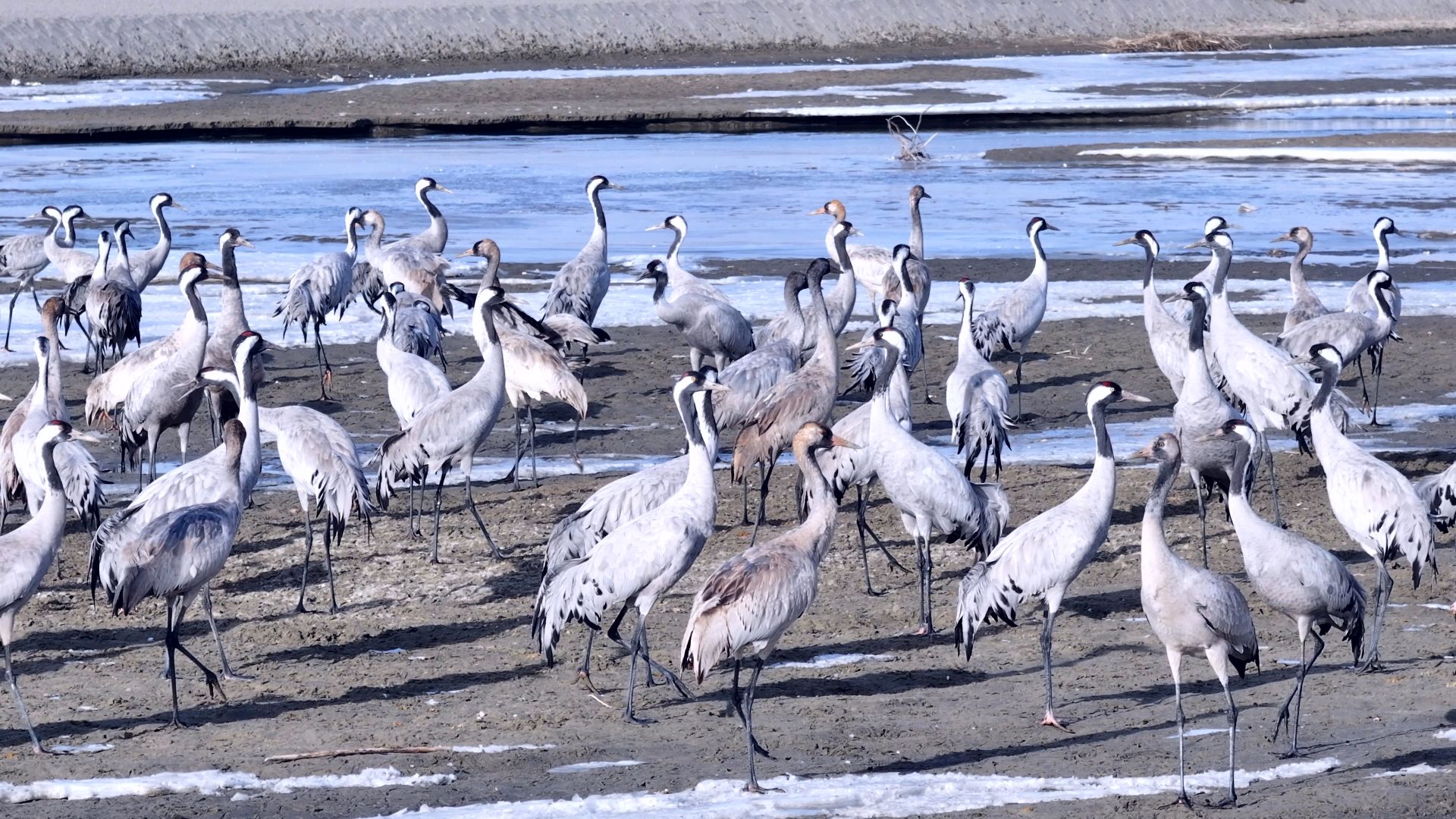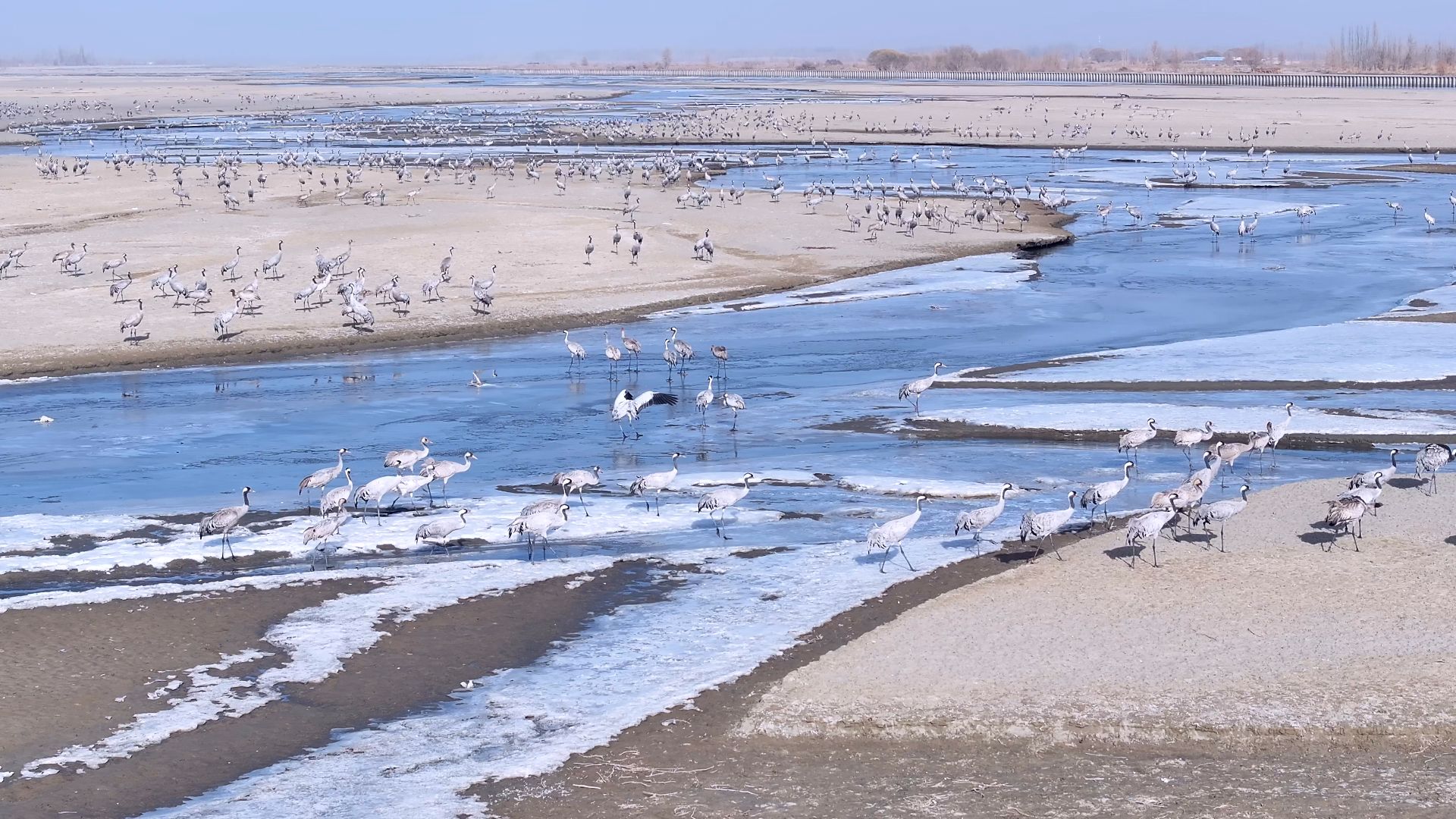 2月27日,记者来到墨玉河喀瓦克段,千余只灰鹤在此悠然栖息,它们或低头觅食、或振翅盘旋、或结伴漫步,身姿优雅,与岸边的沙漠、林带相映成趣。