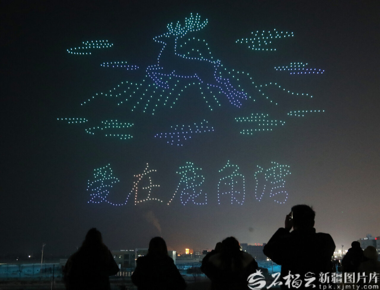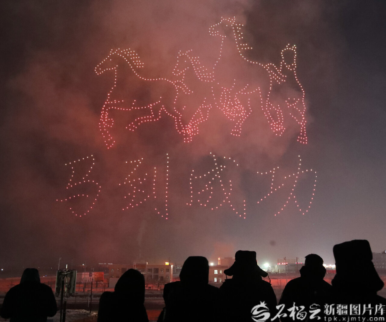 与此同时,1200台无人机组成空中编队,以夜空为卷、光影为笔,勾勒出奔腾骏马、沙湾文旅地标等图景,浮现元宵祝福。科技与文化交融,让观众沉浸式感受光影魅力。