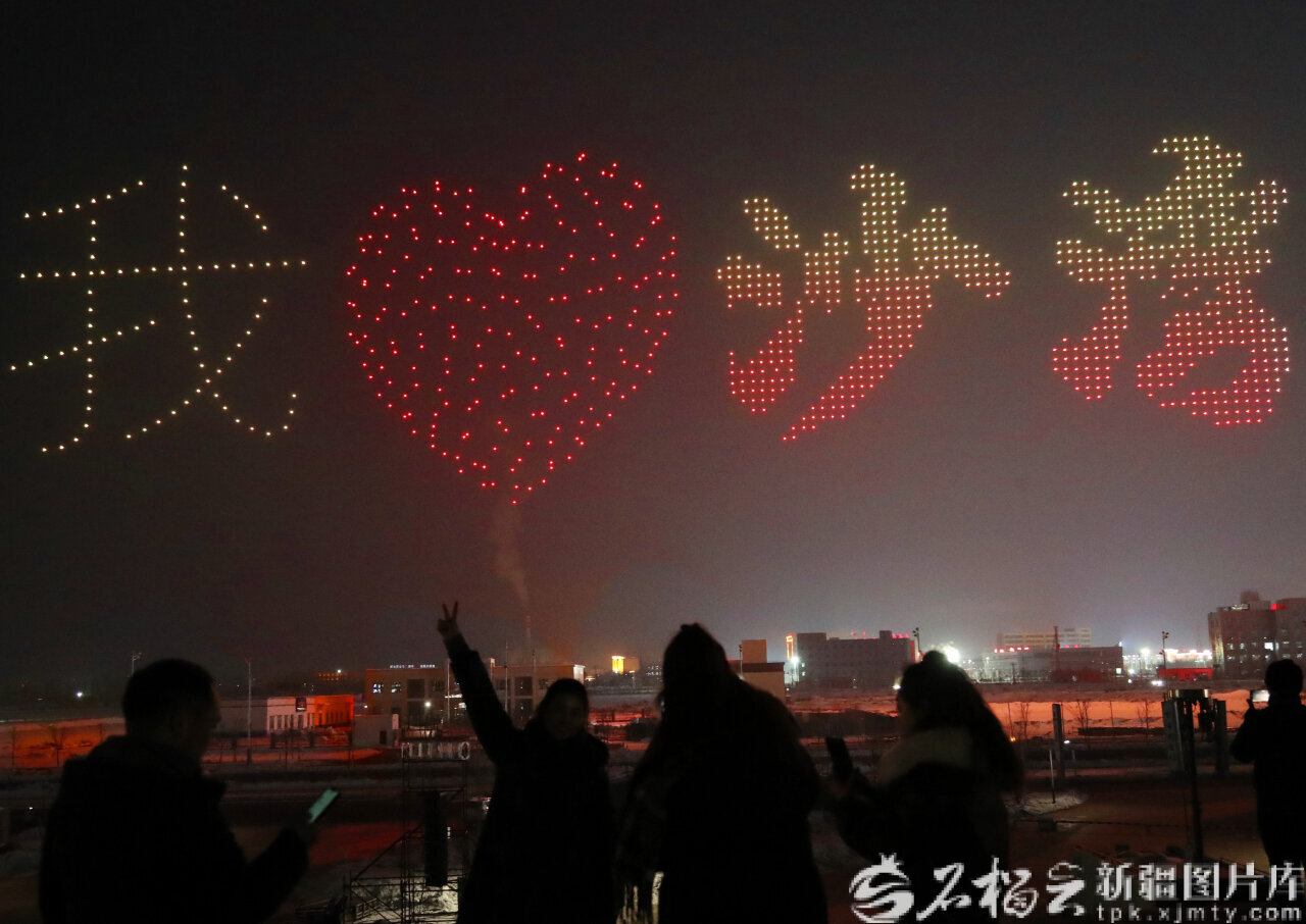 3月3日晚,沙湾市文旅中心上空的无人机光影秀表演。
