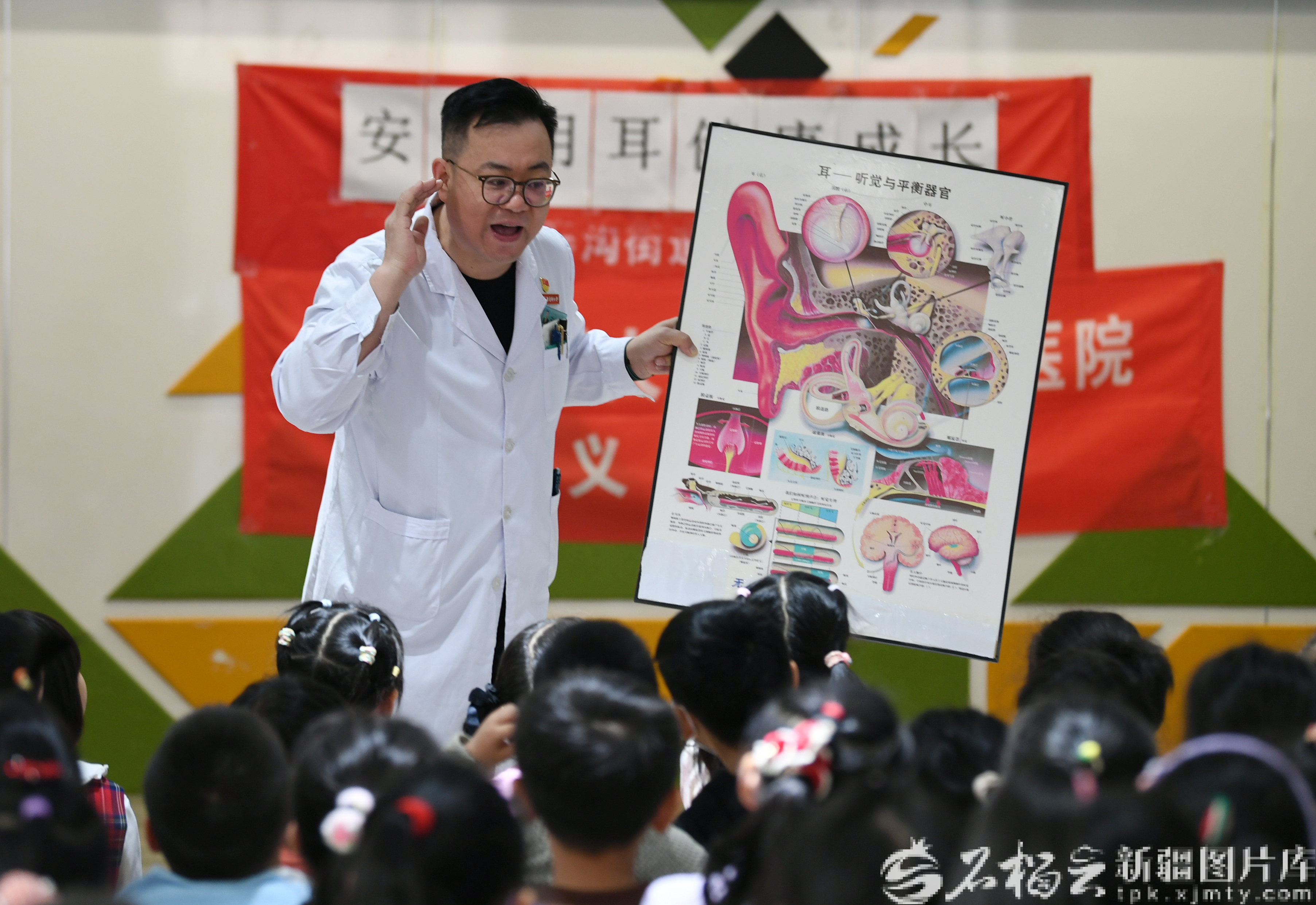 3月3日,新疆医科大学第二附属医院医生为小朋友讲解耳朵的构造。