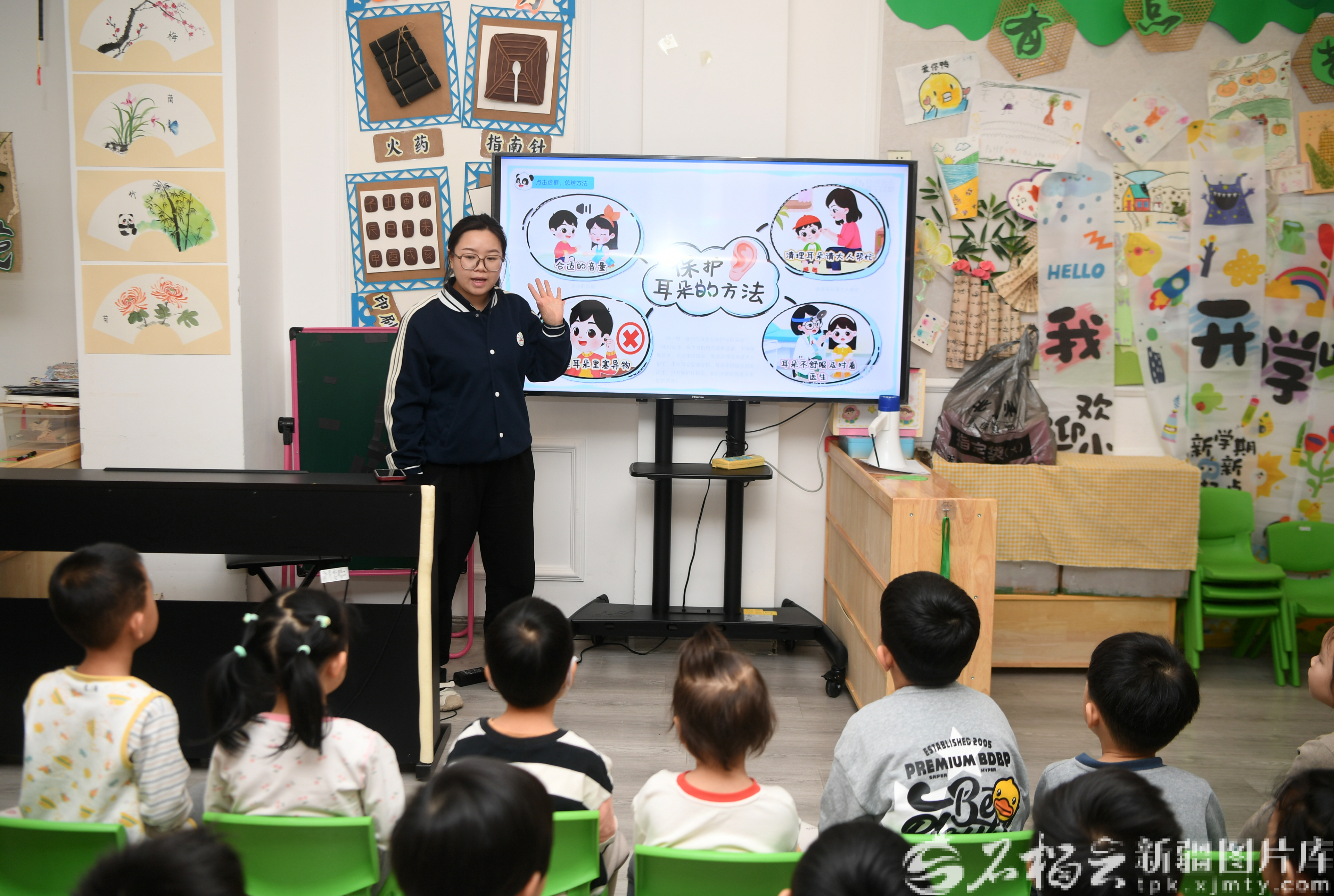 3月3日,幼儿园教师给孩子们讲解爱耳护耳的方法。