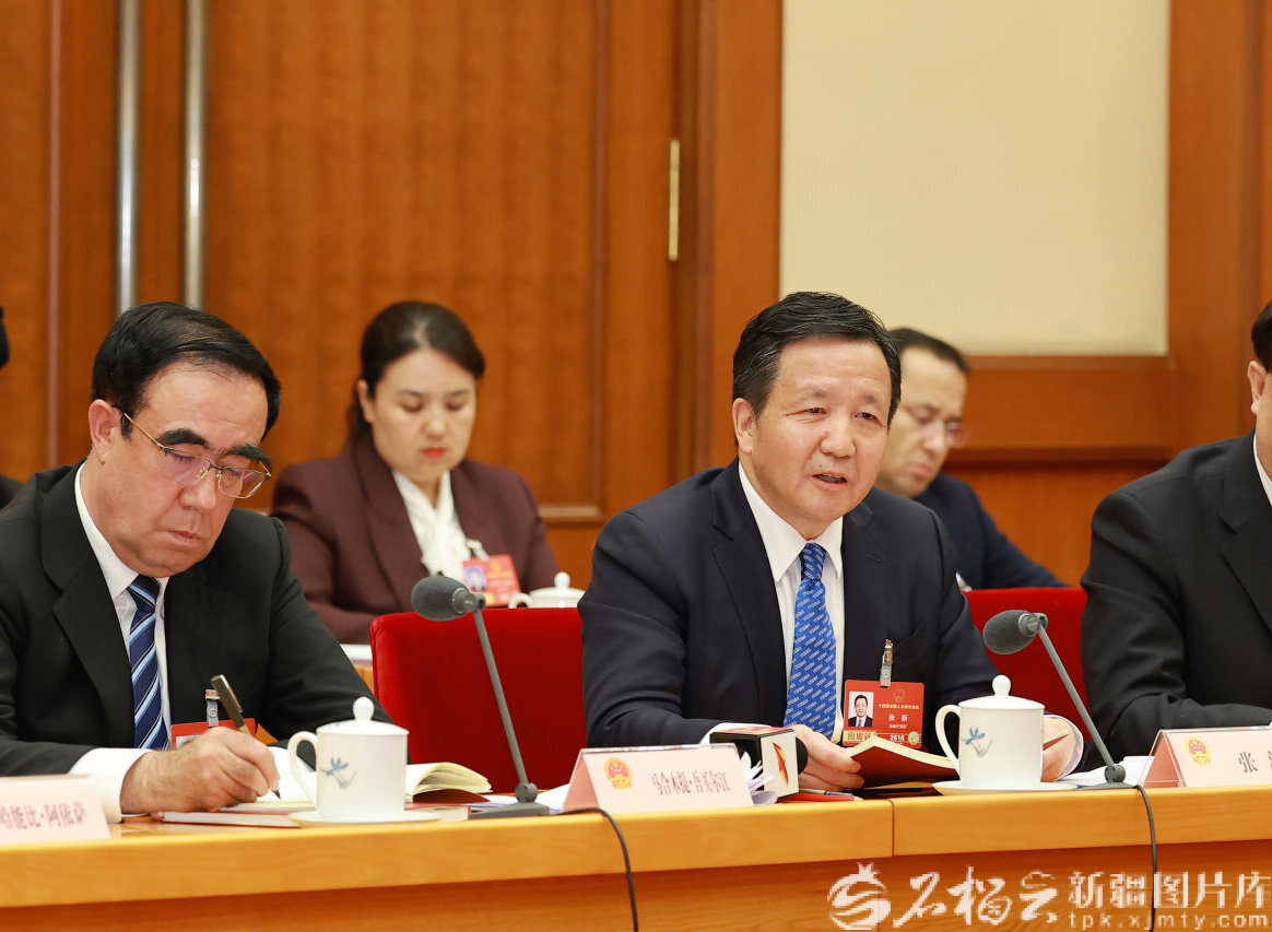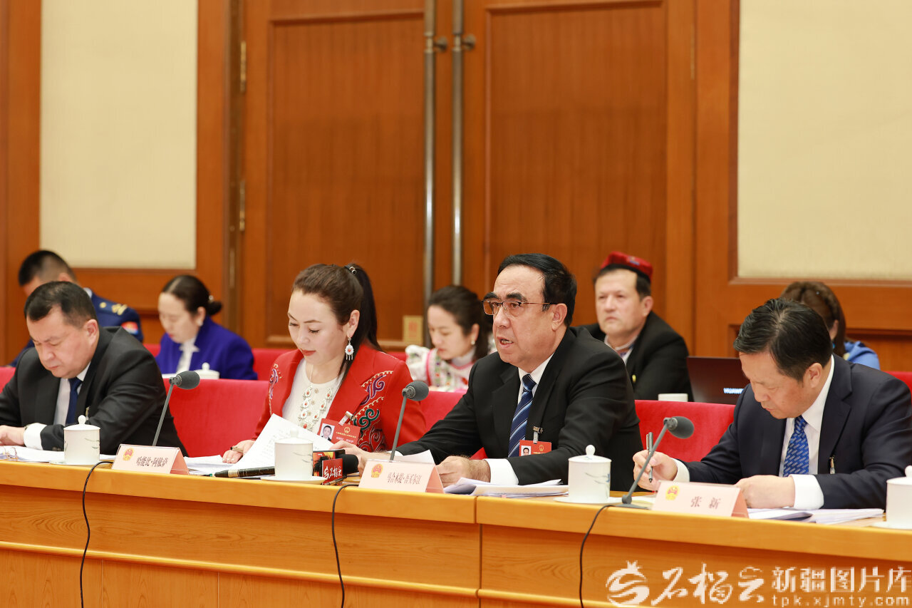 3月5日,出席十四届全国人大四次会议的新疆代表团在驻地举行全体会议,审议政府工作报告。马合木提·吾买尔江代表(前排右二)围绕新型城镇化建设、保障和改善民生等方面内容发言。石榴云/新疆日报记者 崔志坚摄
