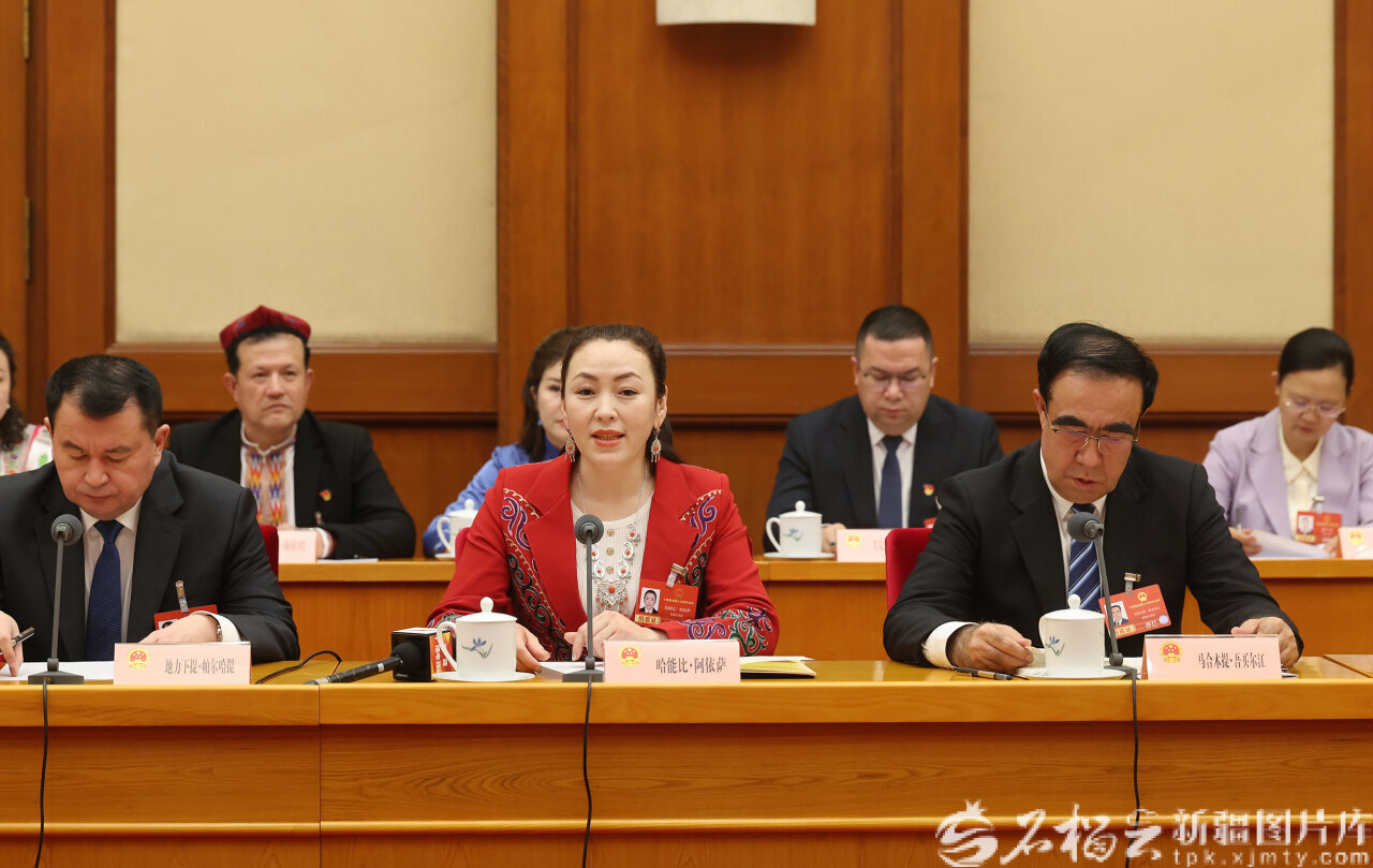 3月5日,出席十四届全国人大四次会议的新疆代表团在驻地举行全体会议,审议政府工作报告。哈能比·阿依萨代表(前排中)围绕完善农村物流体系,打通农产品进城、工业品下乡双向通道等内容发言。石榴云/新疆日报记者 崔志坚摄