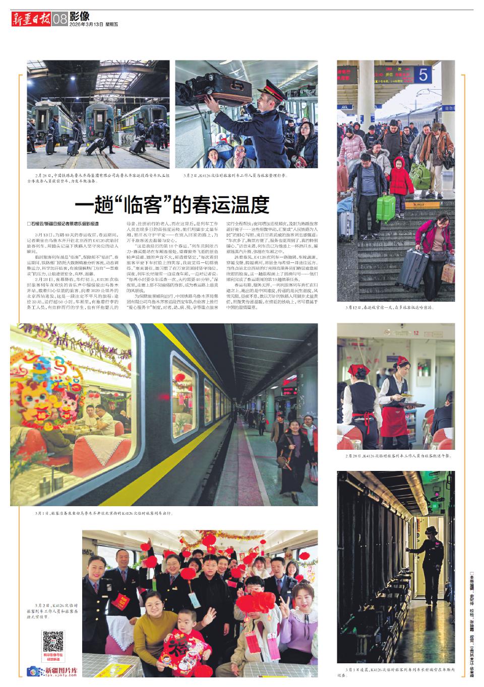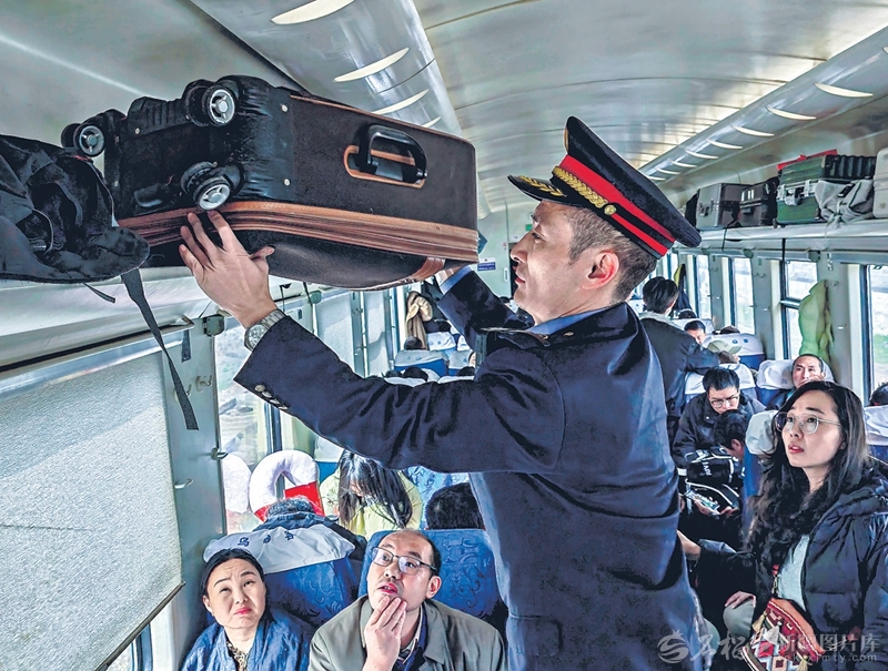3月13日,为期40天的春运收官。春运期间,记者乘坐由乌鲁木齐开往北京西的K4126次临时旅客列车,用镜头记录下铁路人坚守岗位的动人瞬间。