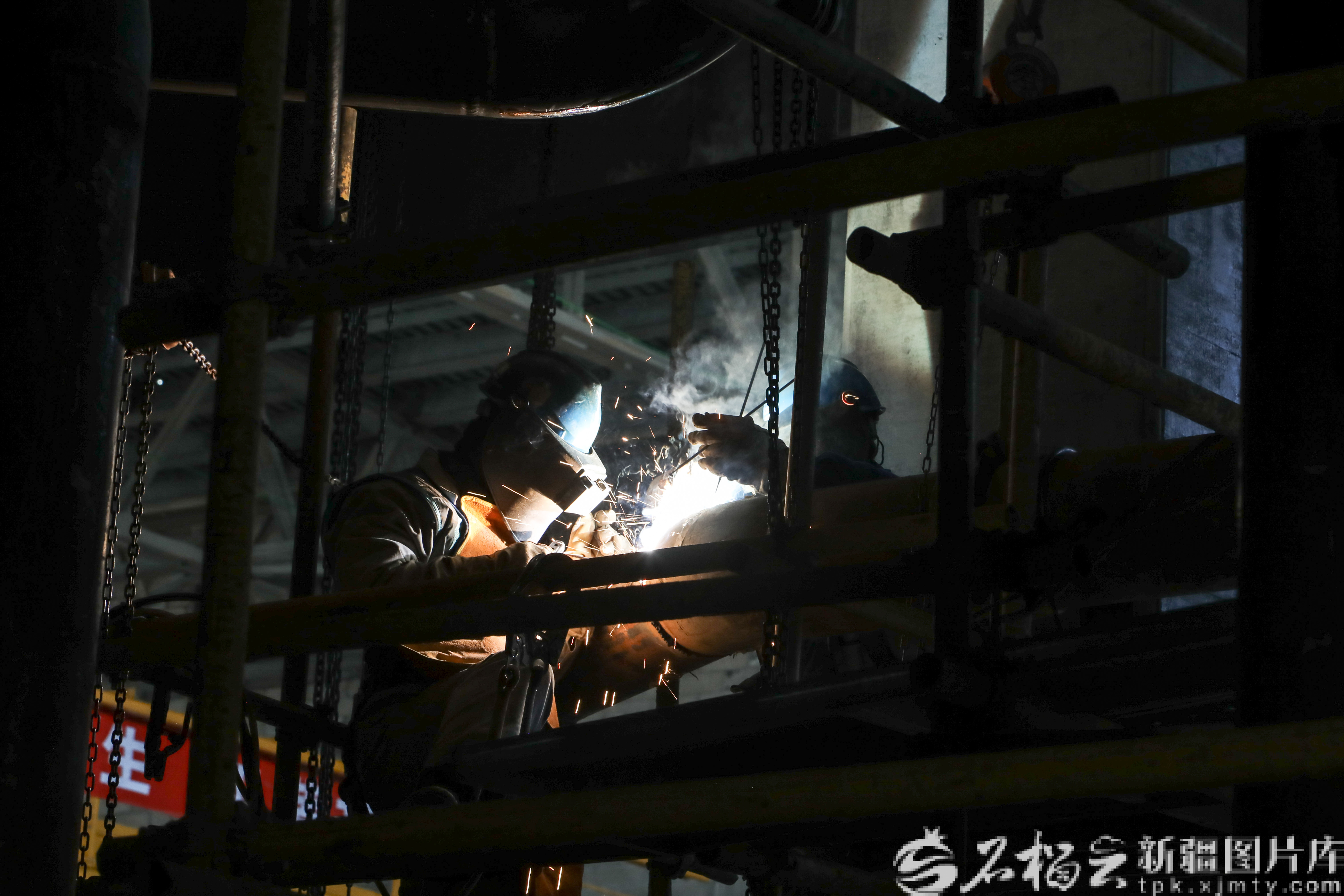 3月16日,工人在中能建哈密“光(热)储”1500MW基地项目现场打磨管道。钟卫亮摄