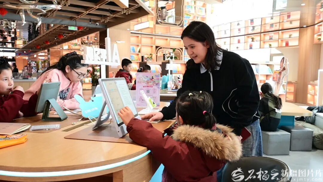 3月14日,喀什新华书店工作人员帮助小朋友查找电子课本。权雅妮 摄