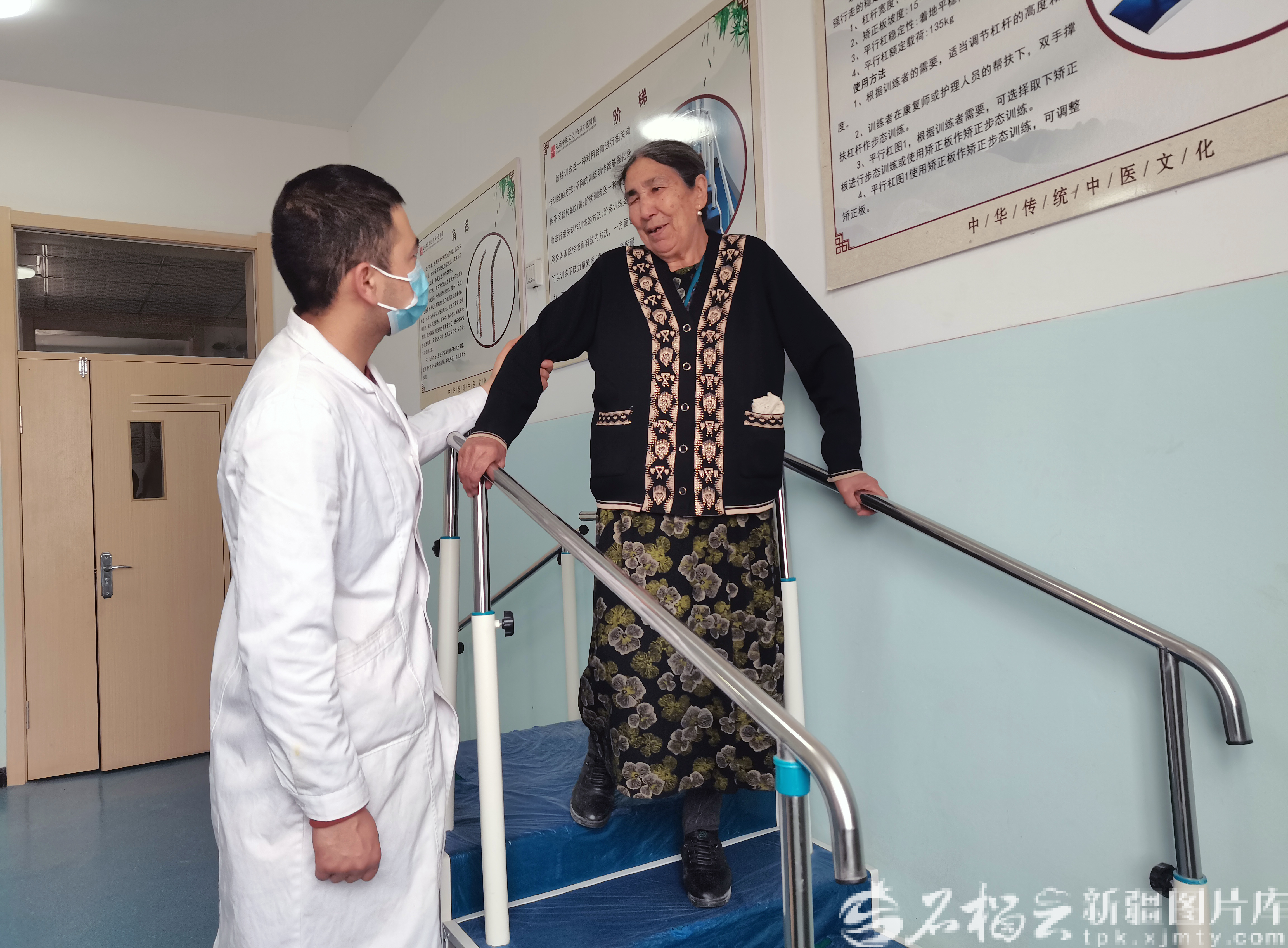 3月17日,在泽普县医共体奎依巴格乡分院的中医馆内,医生帮助患者做康复训练。王华贤 摄