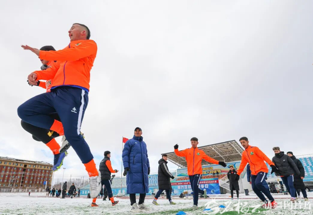 3月11日,2026年第二届博尔塔拉蒙古自治州 “足协杯”选拔赛暨新疆足球超级联赛球员选拔赛在博乐市市民体育场举行。图为球员进行赛前热身。于苏甫·艾尼