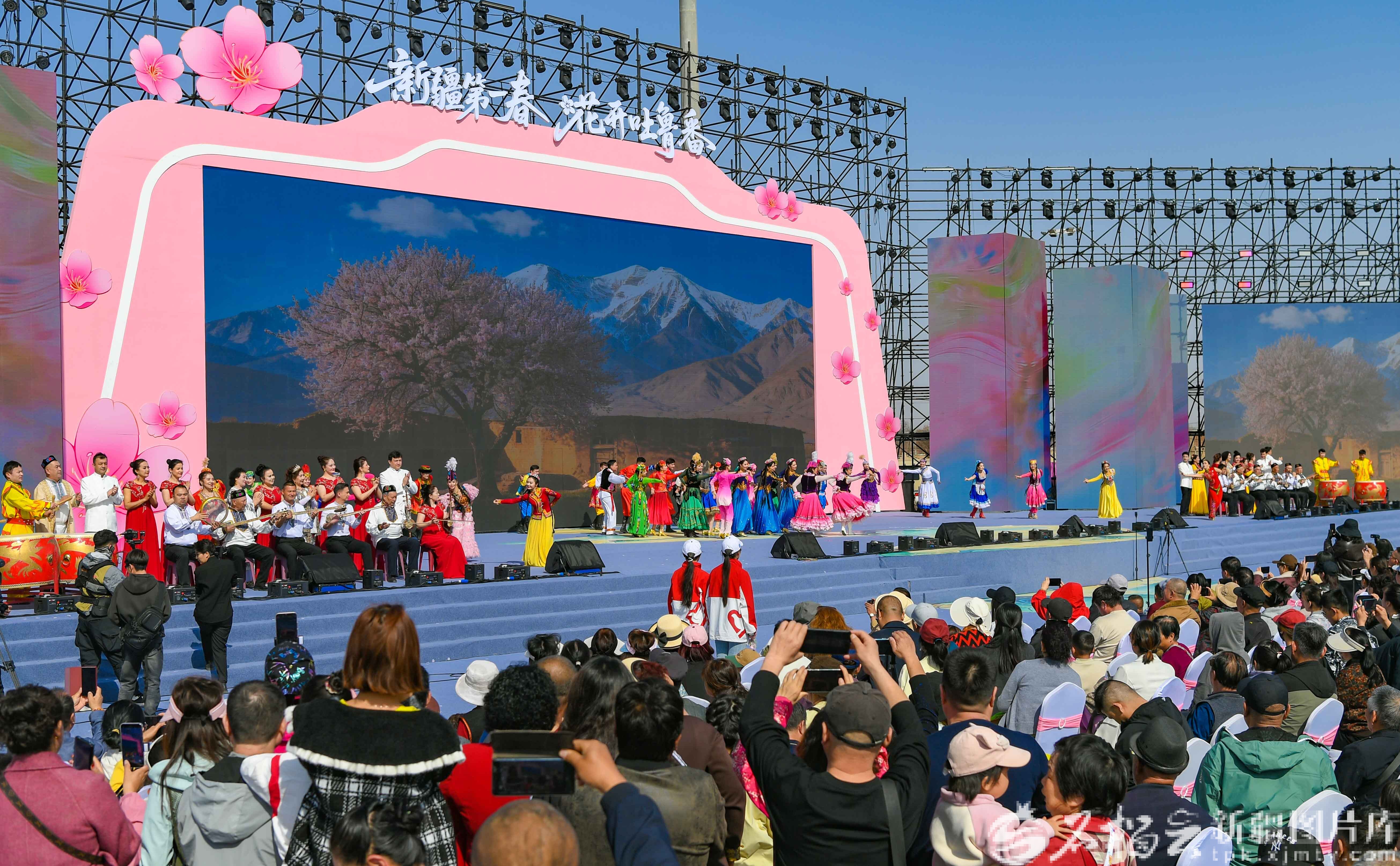 3月20日,马上有“杏”福——“新疆第一春·花开吐鲁番”2026吐鲁番杏花季文旅活动暨托克逊第九届杏花季活动,在托克逊县夏镇南湖村开幕。图为开幕式上的文艺表演。