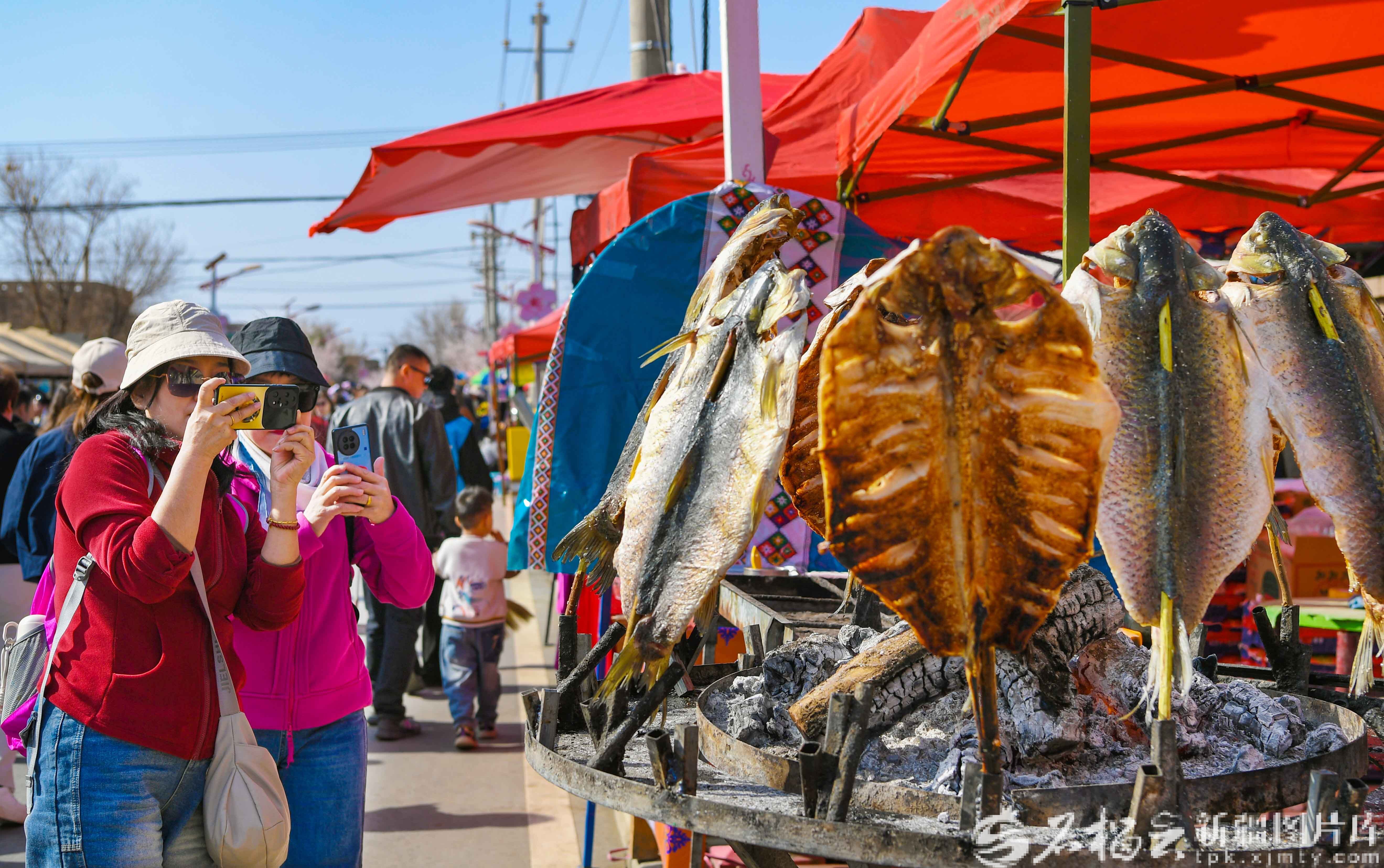 3月20日,游客在托克逊县夏镇南湖村拍摄烤鱼。