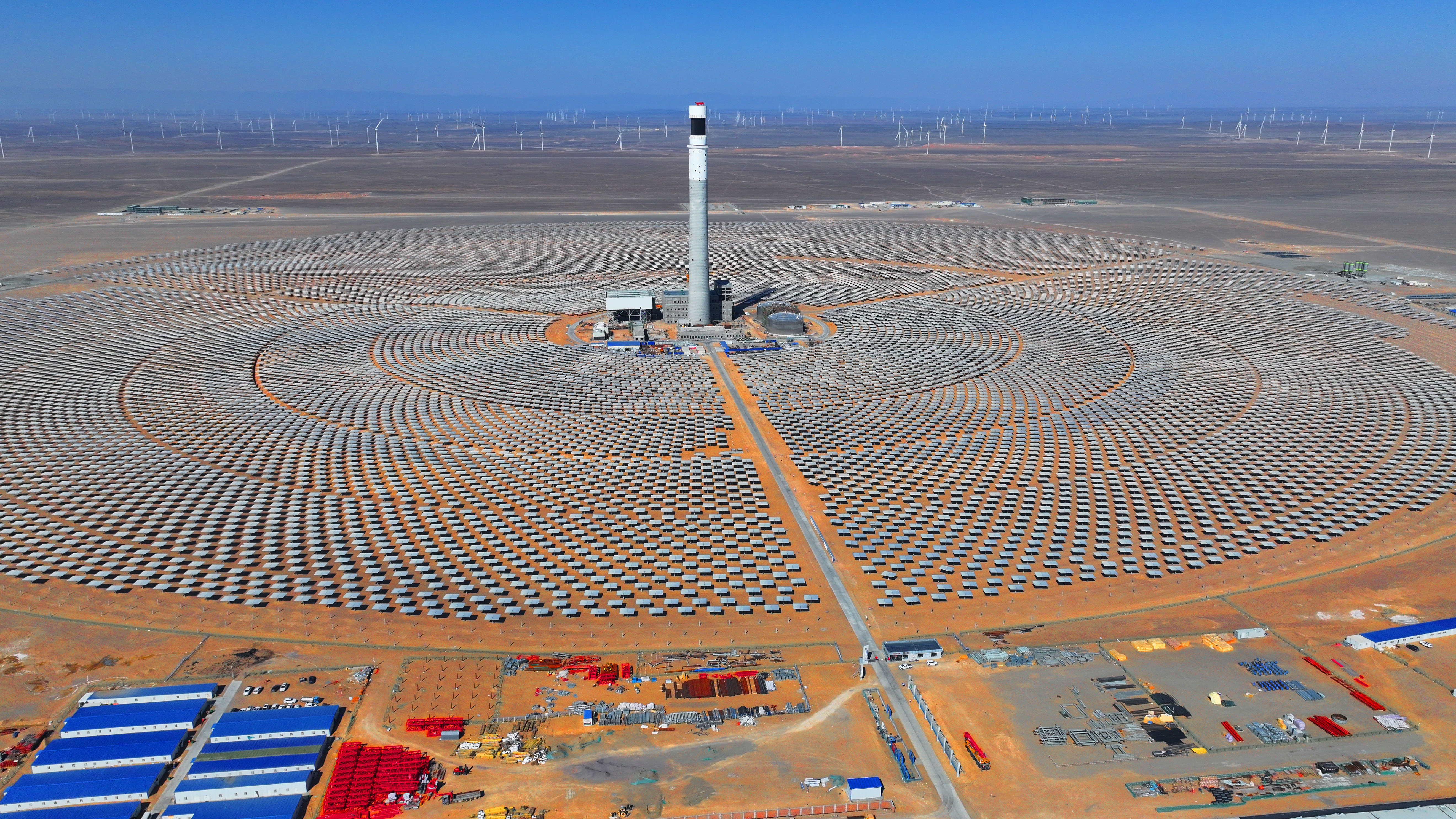 3月16日,俯瞰中能建哈密“光(热)储”1500MW基地项目建设现场。目前,位于巴里坤哈萨克自治县的中能建哈密“光(热)储”1500MW基地项目全面复工。作为国家第二批“沙戈荒”大型风电光伏基地重点工程,项目总装机1500兆瓦,含150兆瓦光热、1350兆瓦光伏。钟卫亮摄