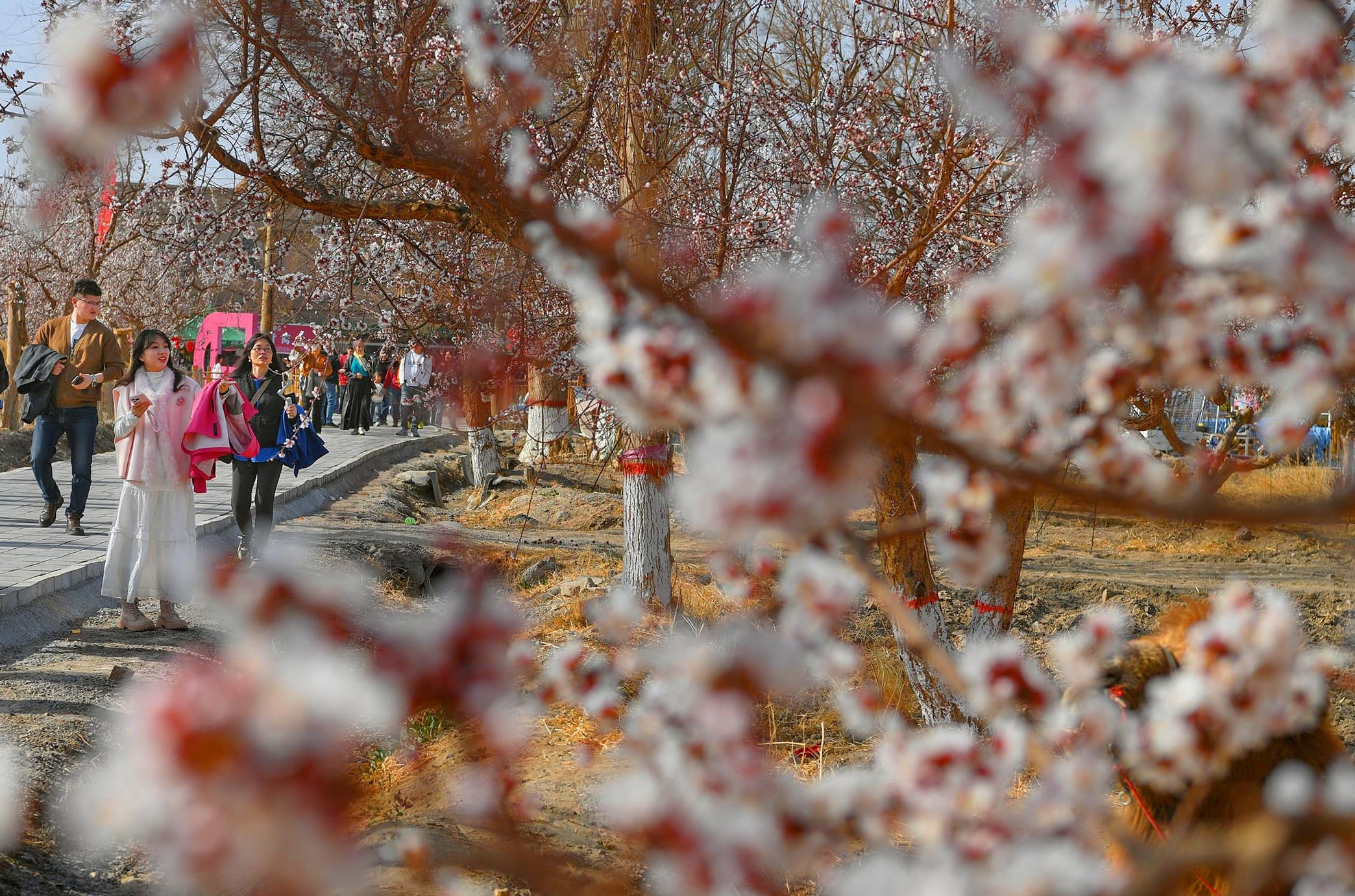 3月20日,马上有“杏”福——“新疆第一春·花开吐鲁番”2026吐鲁番杏花季文旅活动暨托克逊第九届杏花季活动,在托克逊县夏镇南湖村开幕。图为游客游园赏花。石榴云/新疆日报记者 约提克尔·尼加提摄