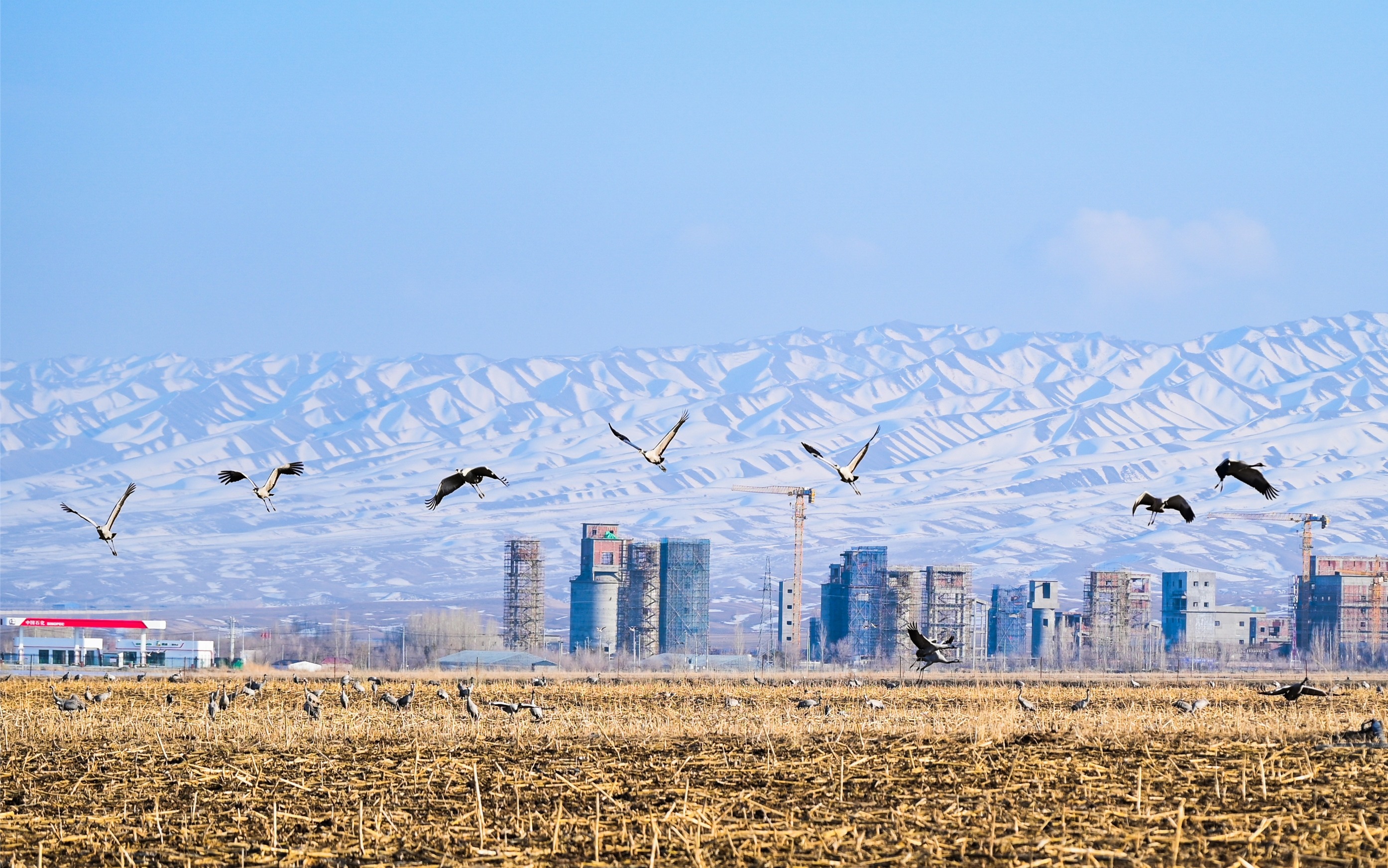 3月20日,呼图壁县石梯子哈萨克族乡白杨河村,成群的灰鹤在融雪的田野间悠闲觅食、展翅起舞。它们优美的身影与远处巍峨的天山、近处宁静的村庄相映成趣,构成一幅和谐的生态画卷。陶维明摄