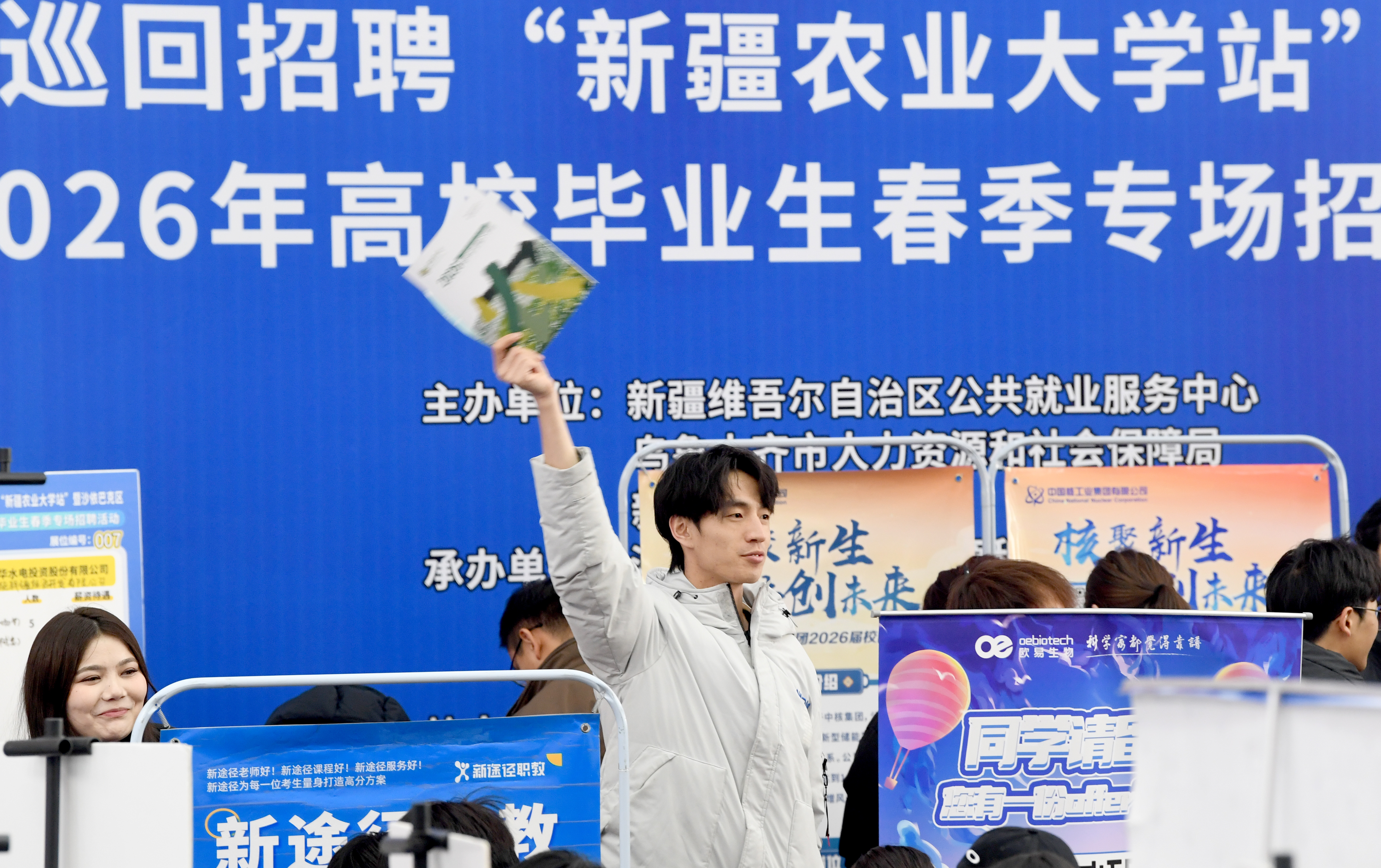 3月16日,一名大学生求职者发现心仪岗位,并呼唤同学前来咨询应聘。当日,全国城市联合招聘高校毕业生巡回招聘2026年春季专场招聘会在新疆农业大学启幕。石榴云/新疆日报记者 韩亮摄