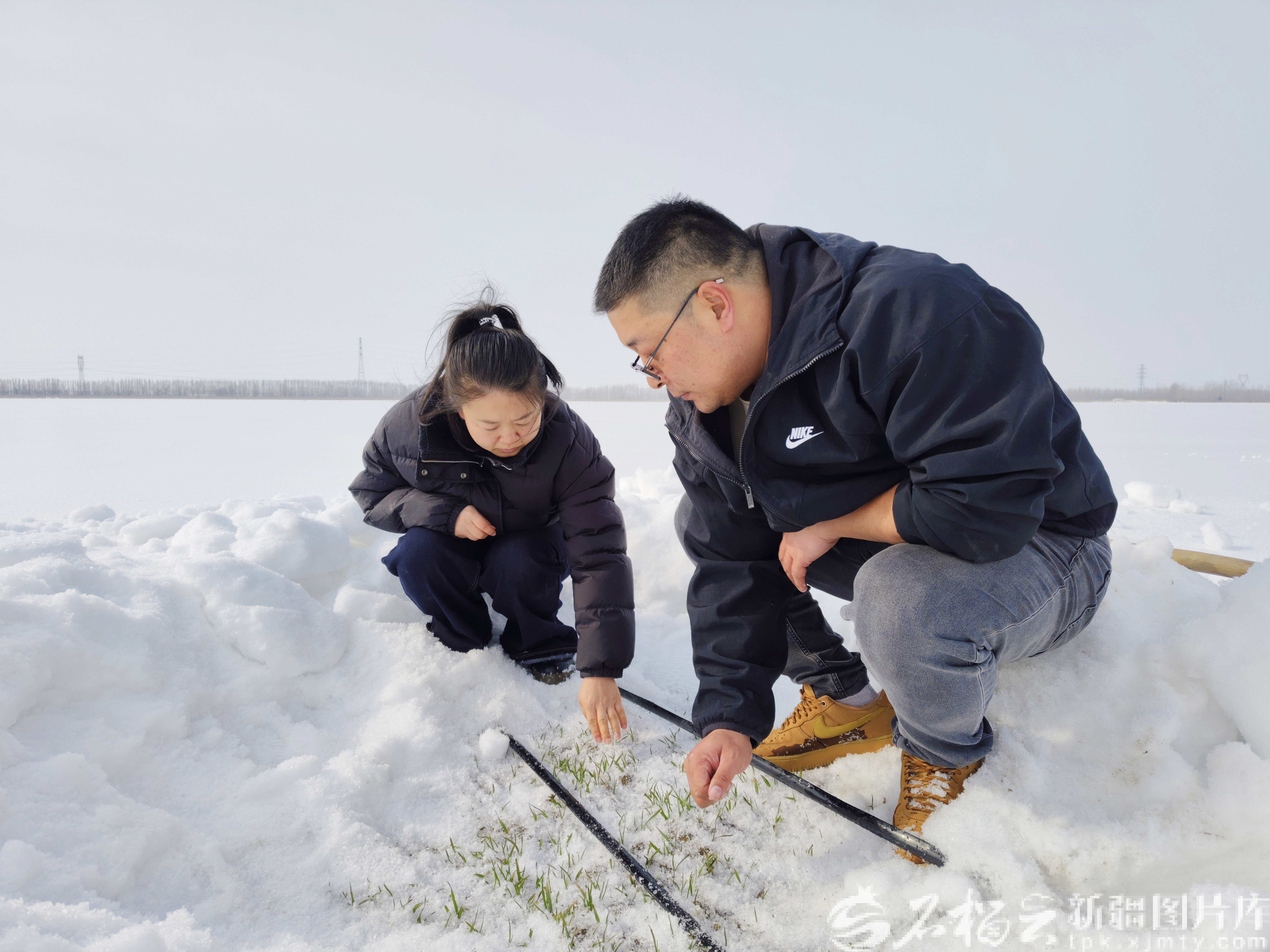 新疆生产建设兵团第八师144团用无人机为4.24万亩冬小麦追肥,让小麦吃上“返青营养餐”。图为3月10日,农技人员在查看冬小麦返青情况。石海摄