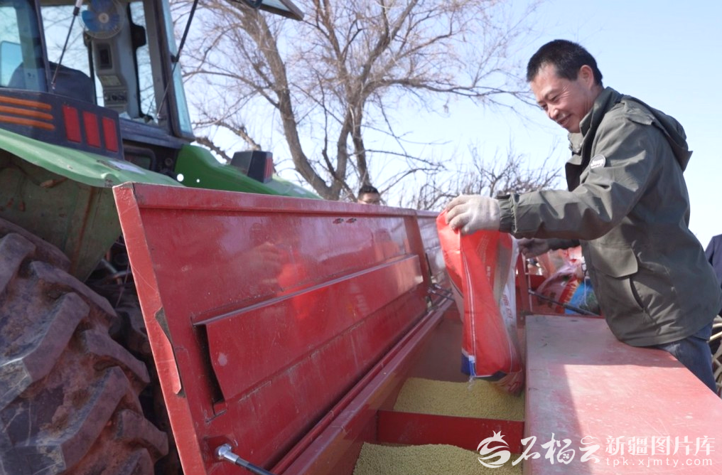 3月18日,在福海县解特阿热勒镇桑斯孜拜阔克铁热克村,村民正在播种春小麦。福海县融媒体中心供图