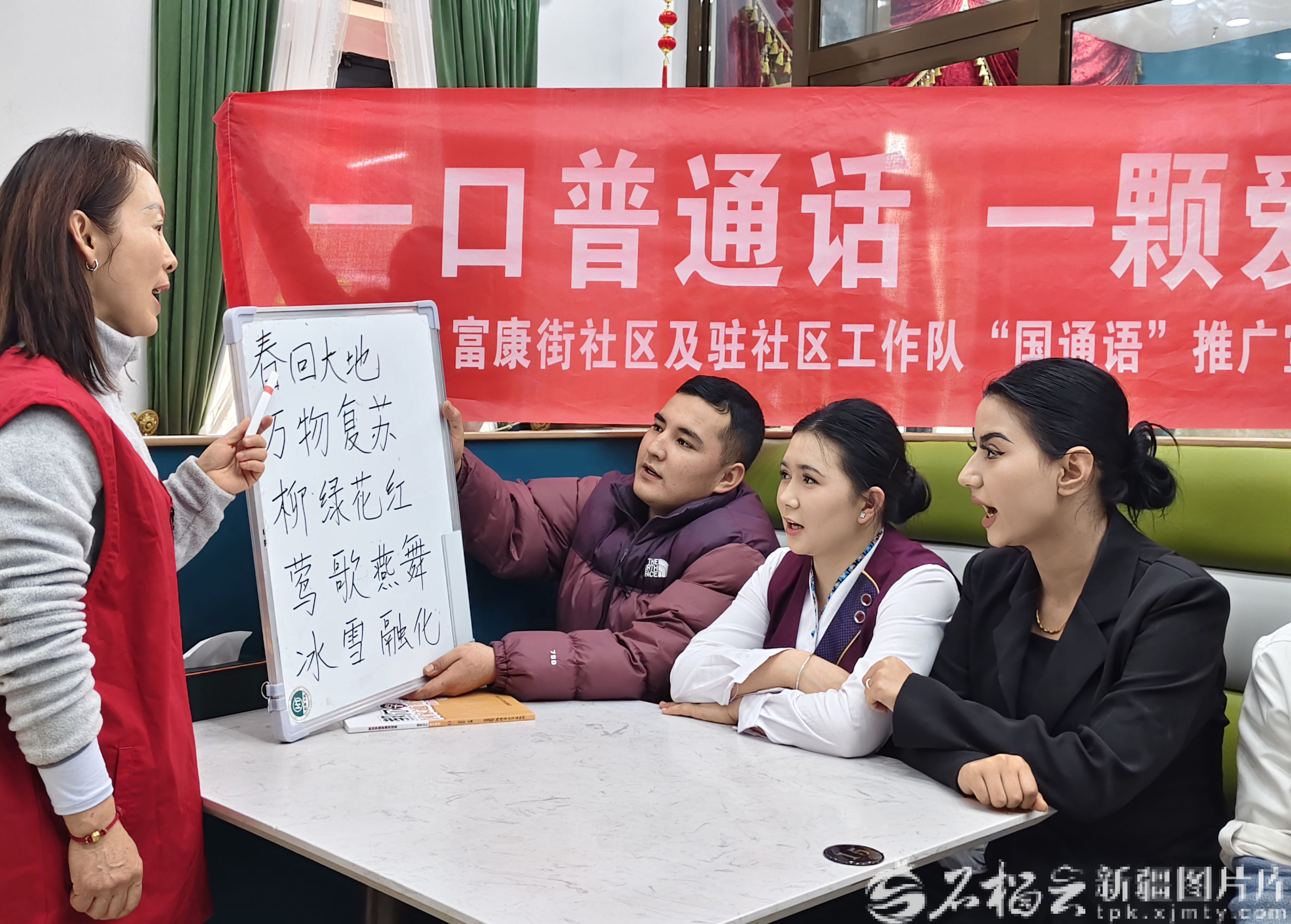 3月18日,乌鲁木齐市天山区黑甲山街道富康街社区联合驻社区工作队,开展“送学上门 服务到家”活动,为辖区餐饮行业从业者普及国家通用语言文字。包粉镯摄