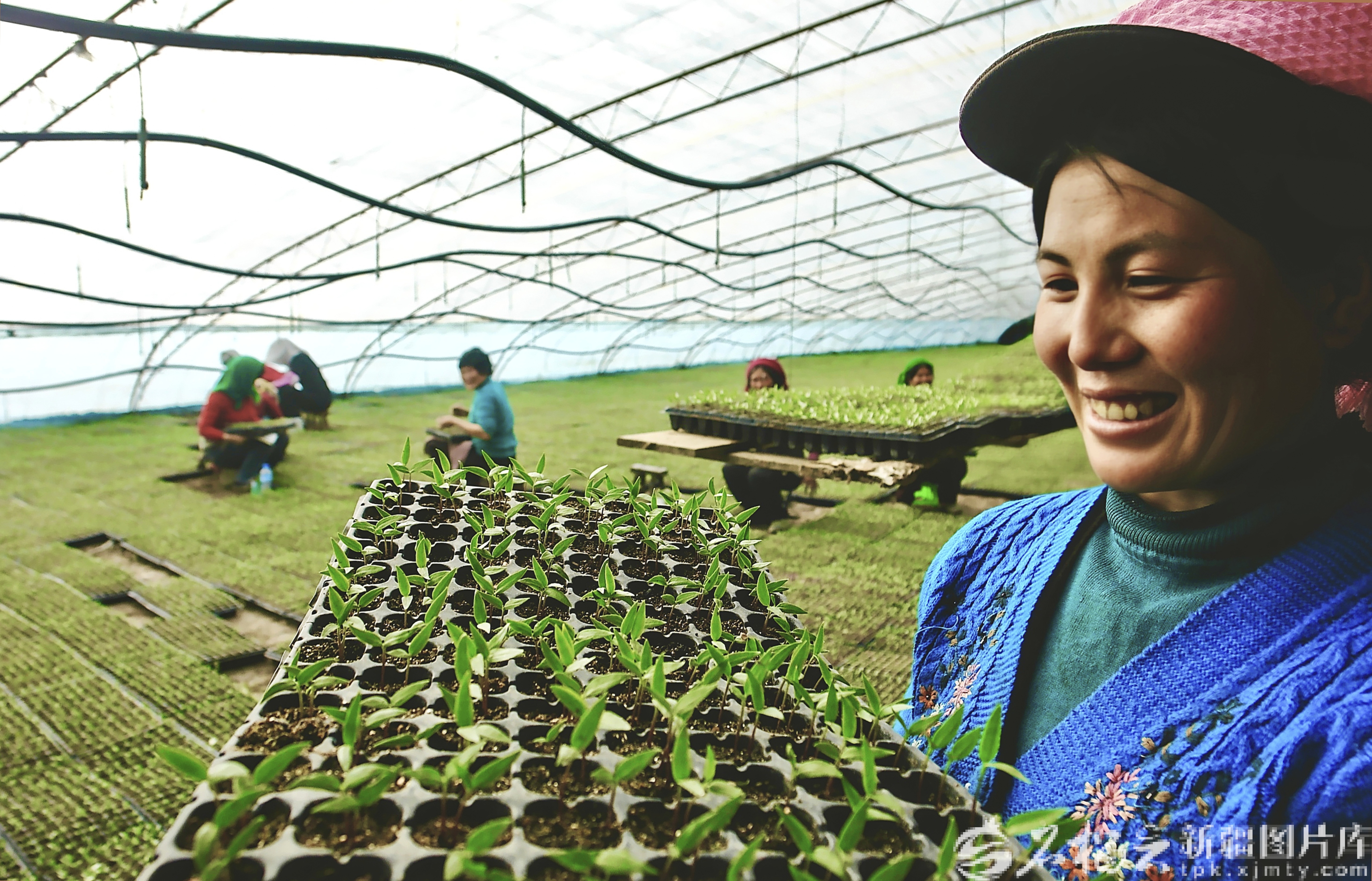 3月18日,兵团第二师24团设施农业高效育苗基地育苗大棚里,种植户在管护菜苗。目前,该师建有日光温室育苗大棚3366座,育苗总量达2519万盘。栗卫平摄