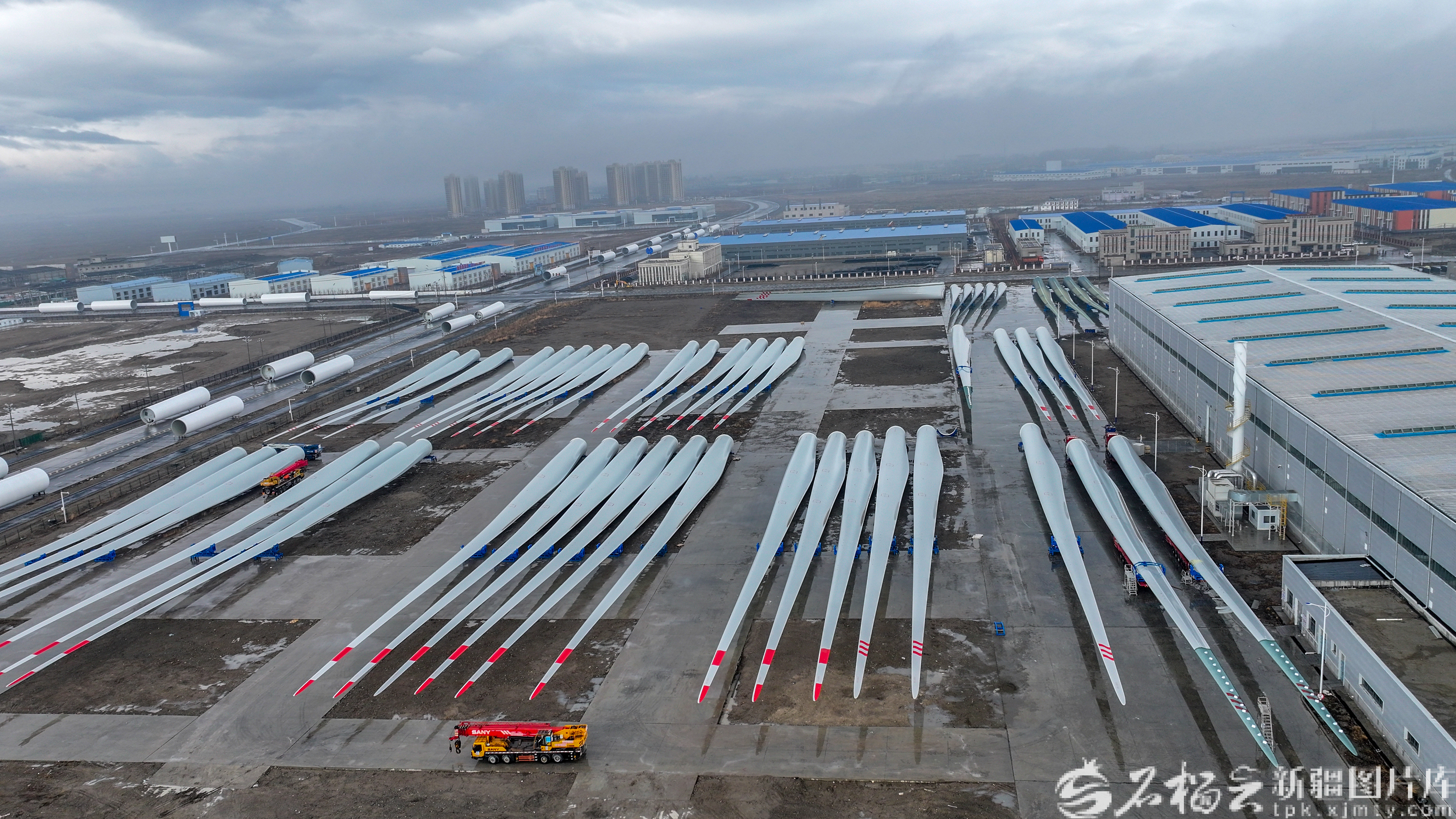 3月24日,三一(塔城)风电设备有限公司,即将出厂的风机叶片等待装车。