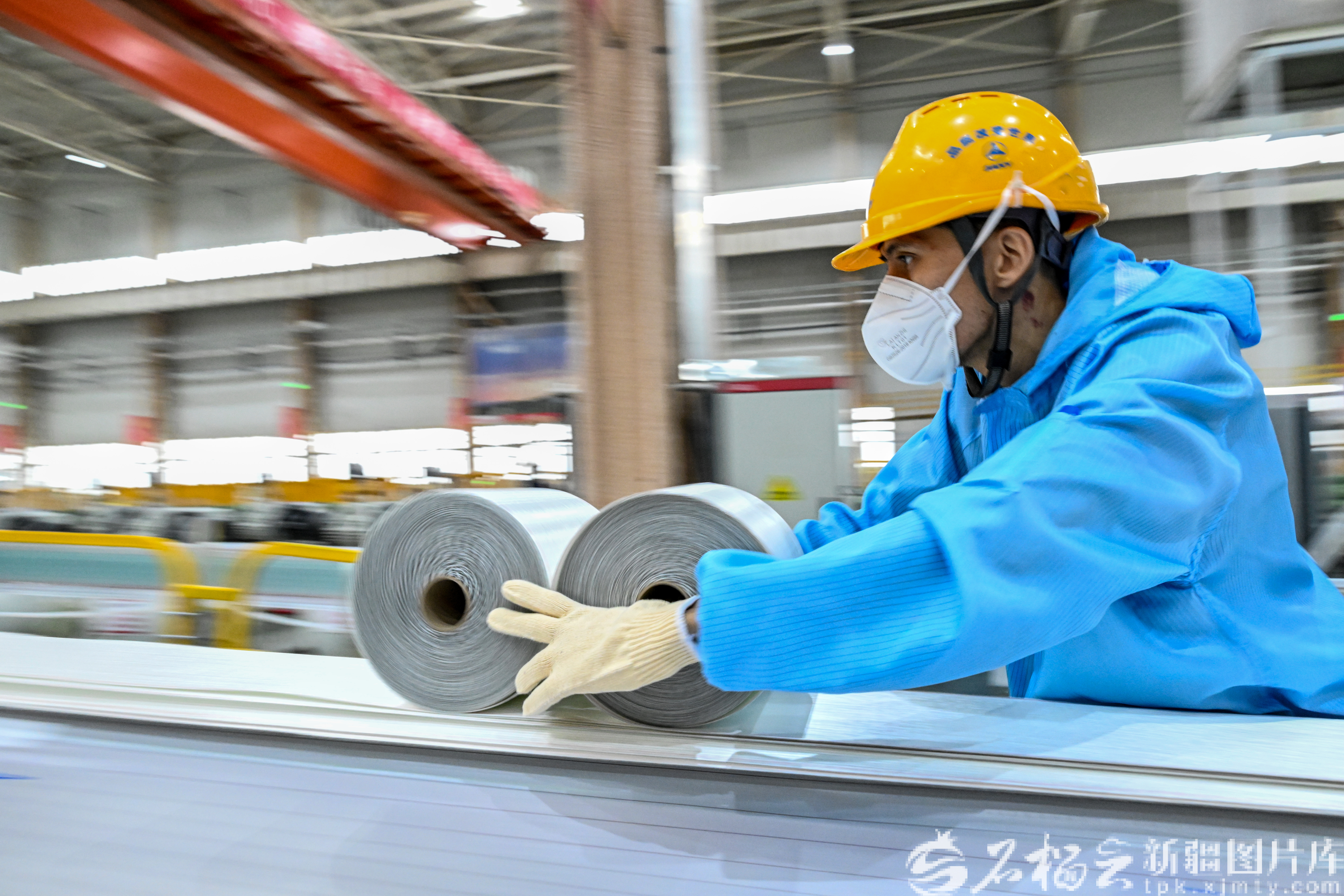 3月24日,三一(塔城)风电设备有限公司生产车间,工人在生产风机叶片辅助材料。