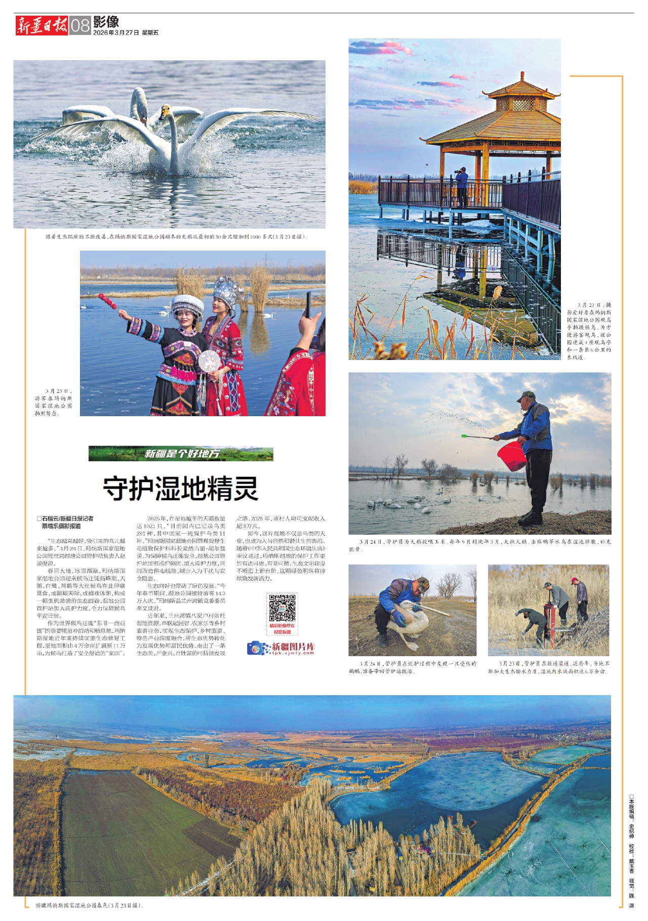 2025年,在湿地越冬的天鹅数量达1021只。“目前园内已记录鸟类281种,其中国家一级保护鸟类11种。”玛纳斯国家湿地公园管理局野生动植物保护科科长麦然古丽·胡尔曼说。为保障候鸟迁徙安全,湿地公园管护站加密巡护频次、加大巡护力度,同时改造供电线路,减少人为干扰与安全隐患。