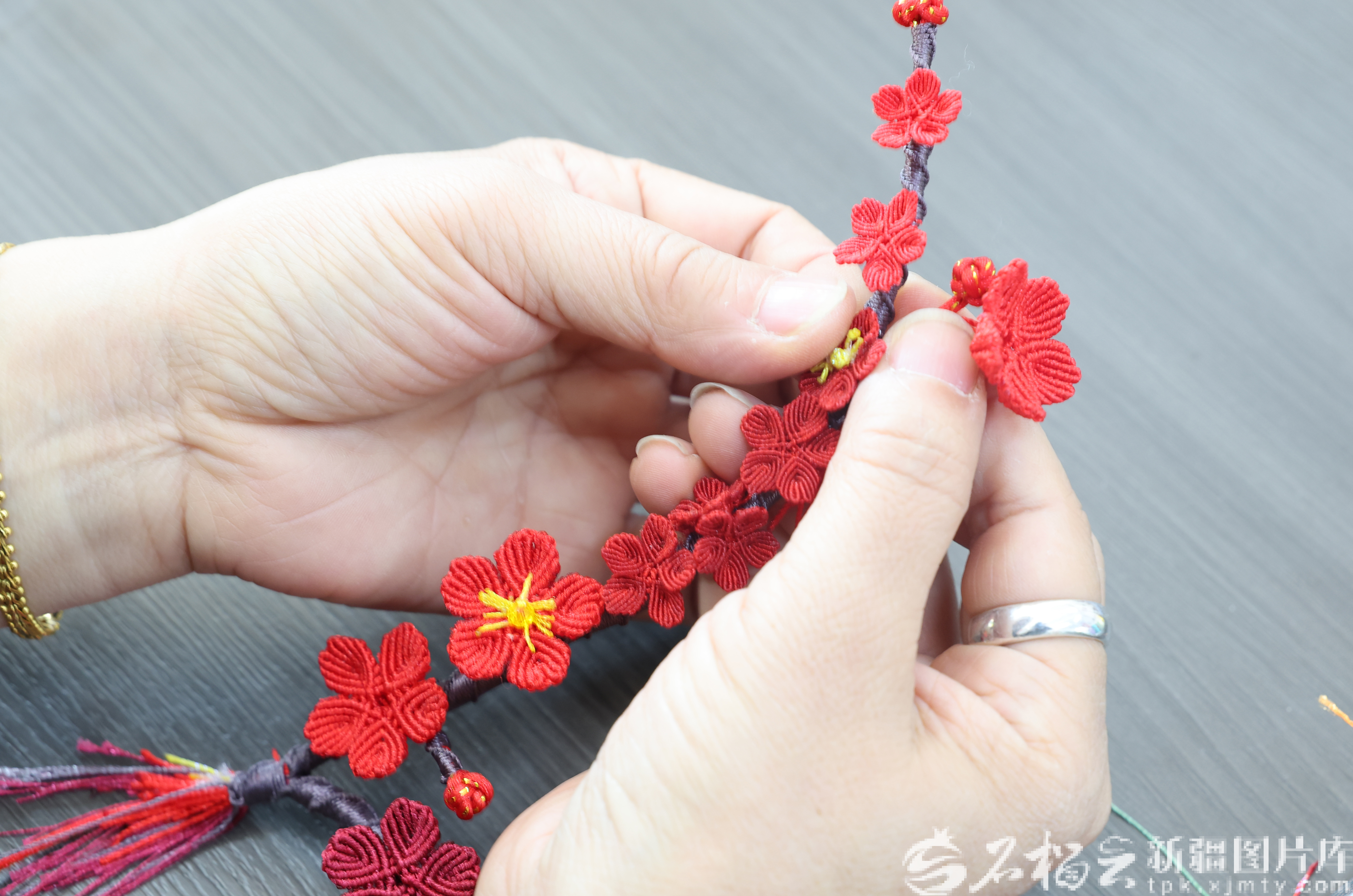 赵玲制作的具有民族特色的绳结作品(3月26日摄)。
