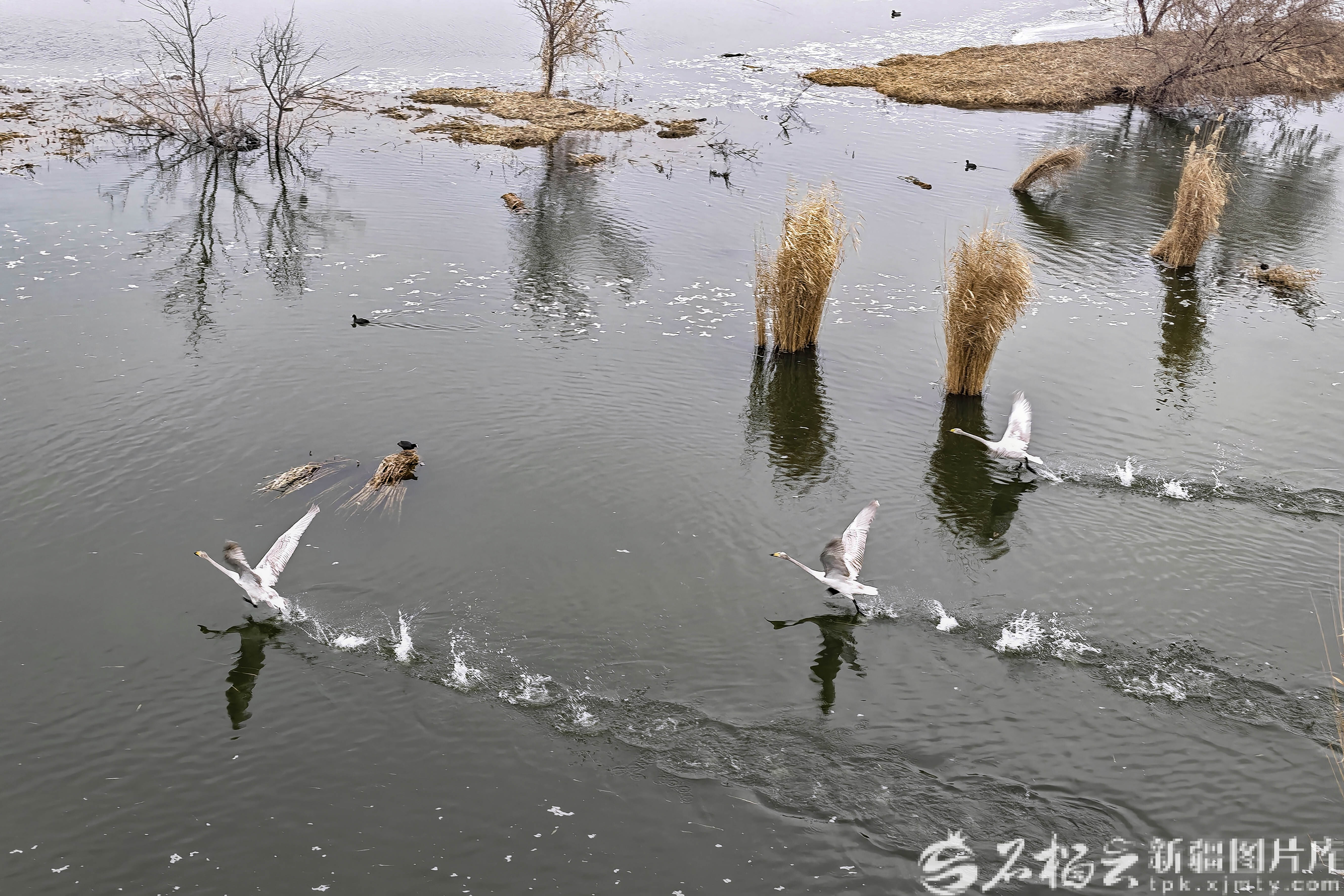 3月24日,天鹅在玛纳斯国家湿地公园嬉戏。石榴云/新疆日报记者 蔡增乐摄