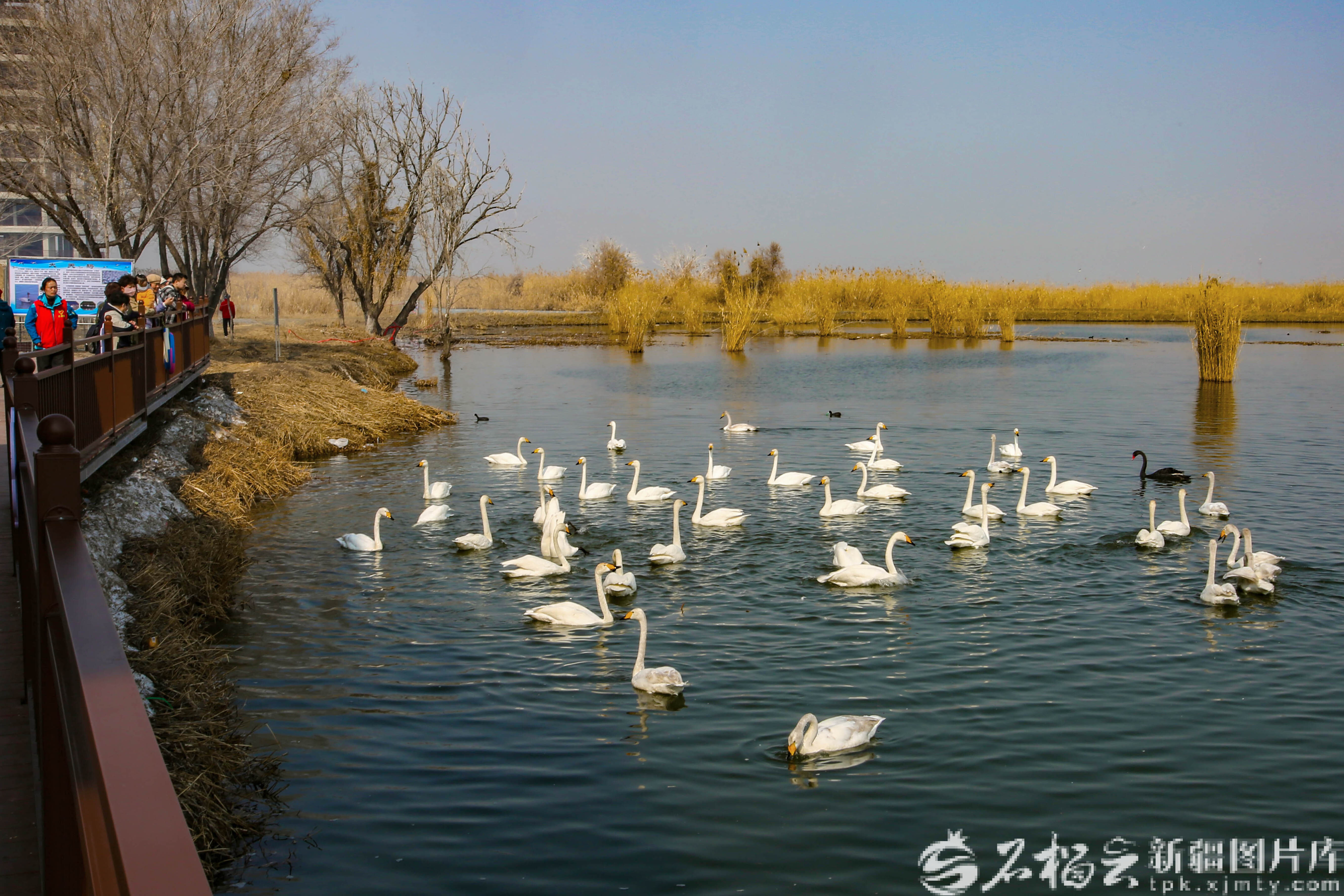 3月23日,游客在玛纳斯国家湿地公园观赏天鹅。石榴云/新疆日报记者 蔡增乐摄