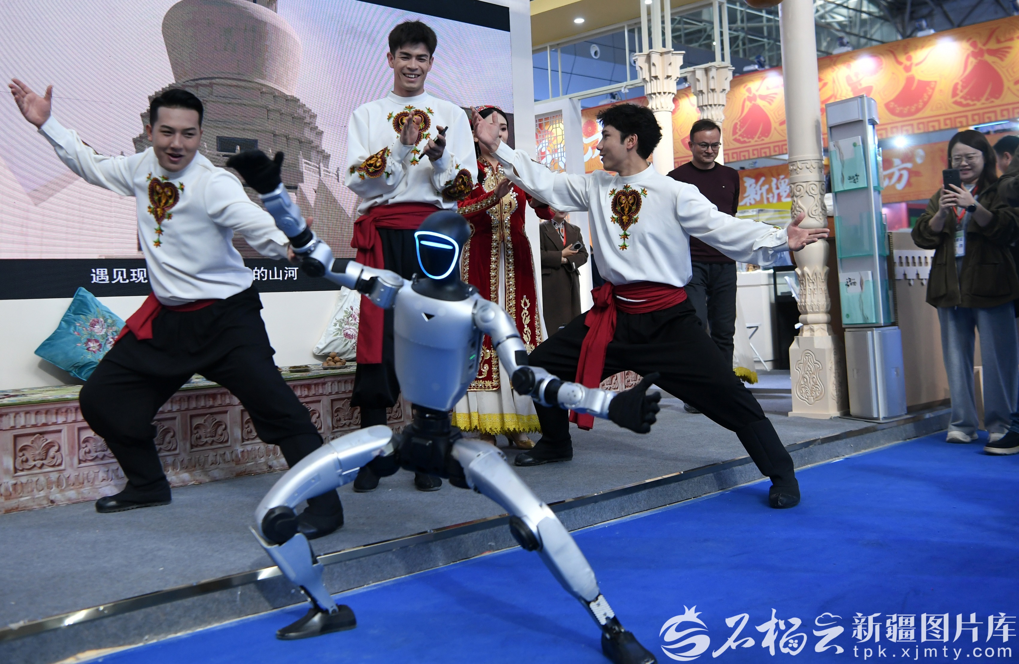 3月28日,在第七届新疆春季旅游博览会上,演员与宇树科技G1机器人互动。本届展会以“文旅融合・智慧赋能”为主题,将前沿科技与新疆特色文旅资源深度融合,为参展客商与现场观众献上一场兼具科技感与地域特色的春季文旅盛宴。石榴云/新疆日报记者 秦梅花摄
