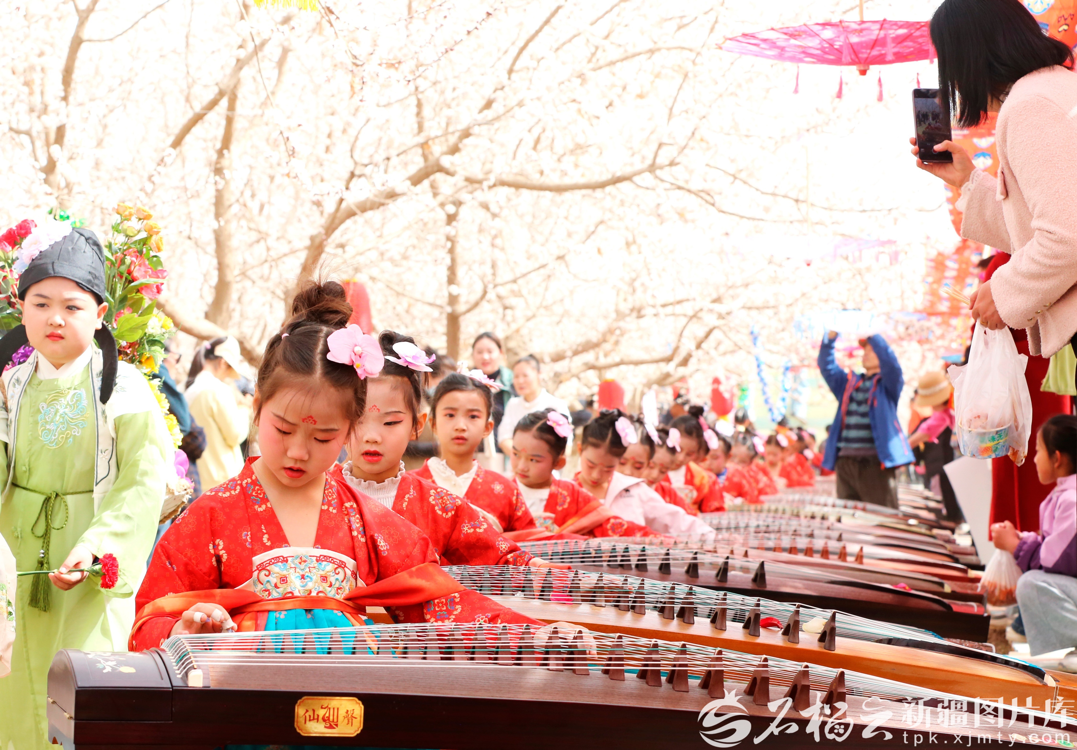3月28日,孩子们表演古筝合奏。当日,库车市“杏花丝路 春满龟兹”系列文体活动在牙哈镇托克乃村开幕,吸引众多游客前来赏花游玩。吐尔松·托胡提摄