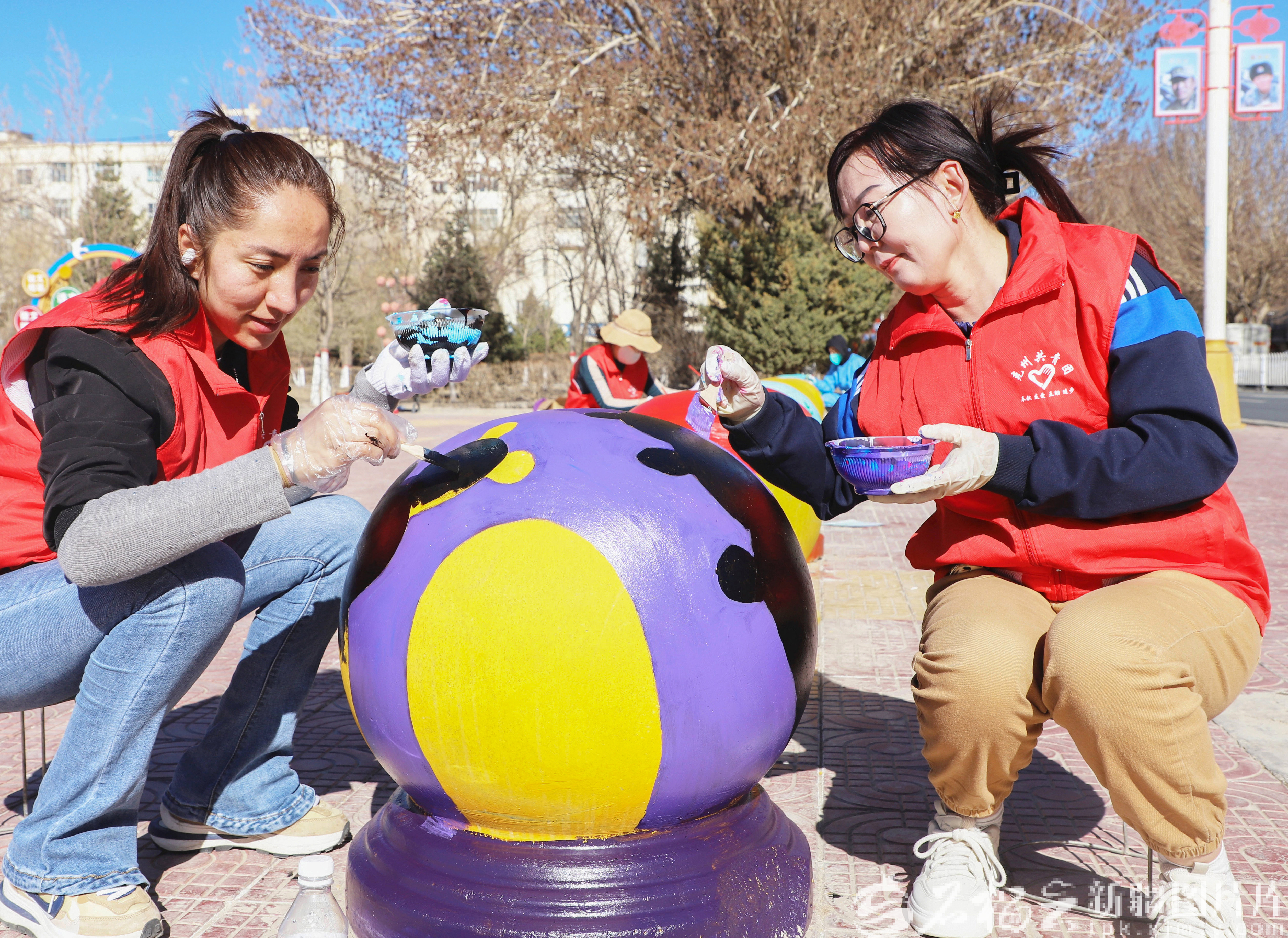3月25日,志愿者在阿合奇县人民广场开展 “手绘添彩 扮靓家园” 志愿服务活动,将文明新风、民族团结、家园美景等内容融入石墩画作,用创意色彩美化公共空间。徐刚摄