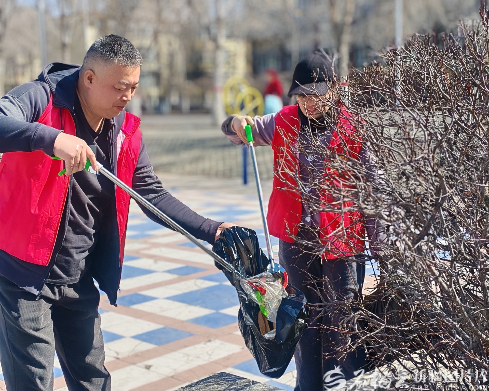 3月26日,乌鲁木齐市米东区石化街道中兴社区组织党员志愿者开展环境卫生整治志愿服务活动,优化社区环境。马月萍摄