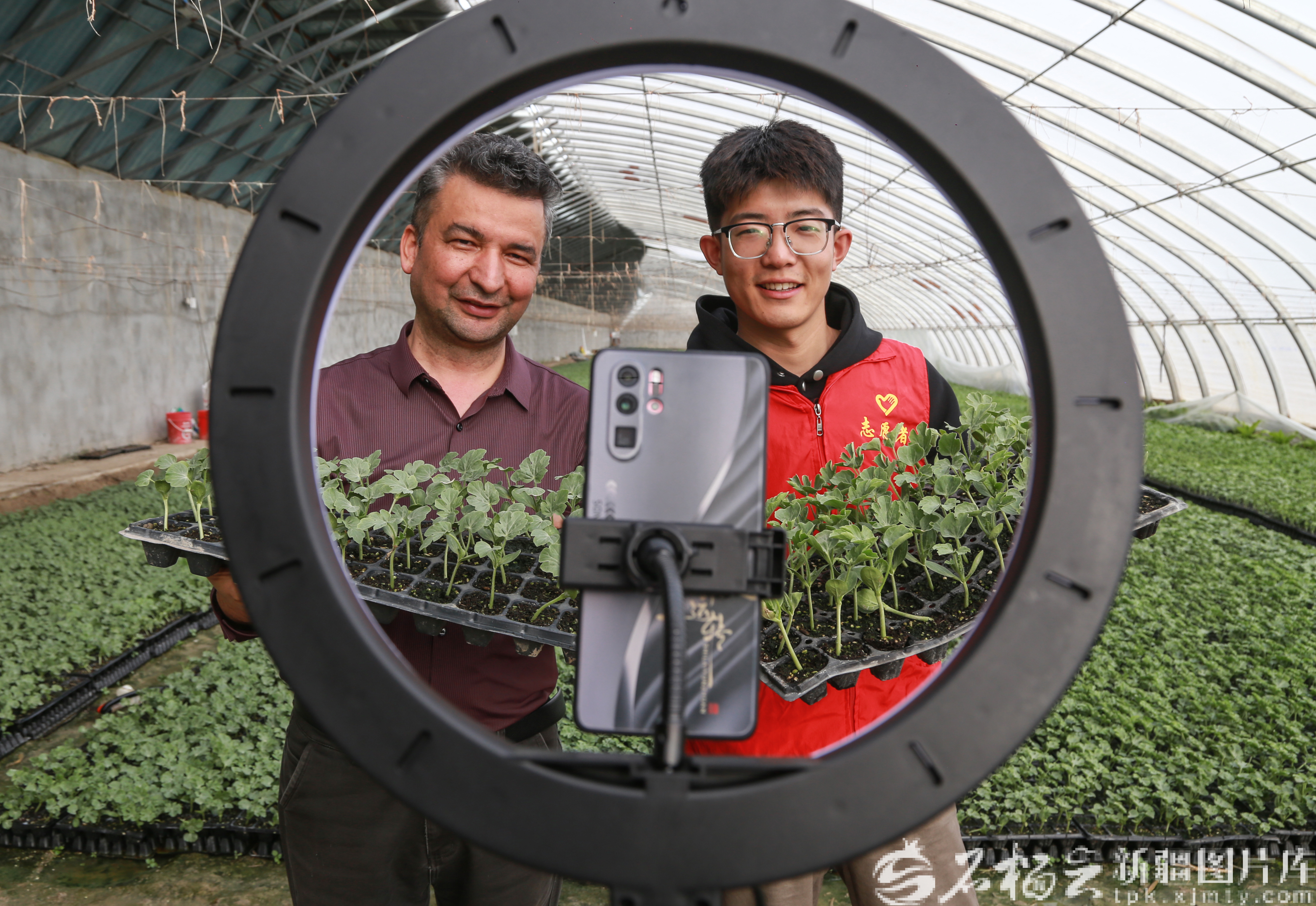 3月26日,在阿瓦提县乌鲁却勒镇红旗村温室大棚里,当地新农人通过直播带货的方式帮助村民推广销售西瓜苗。包良廷摄