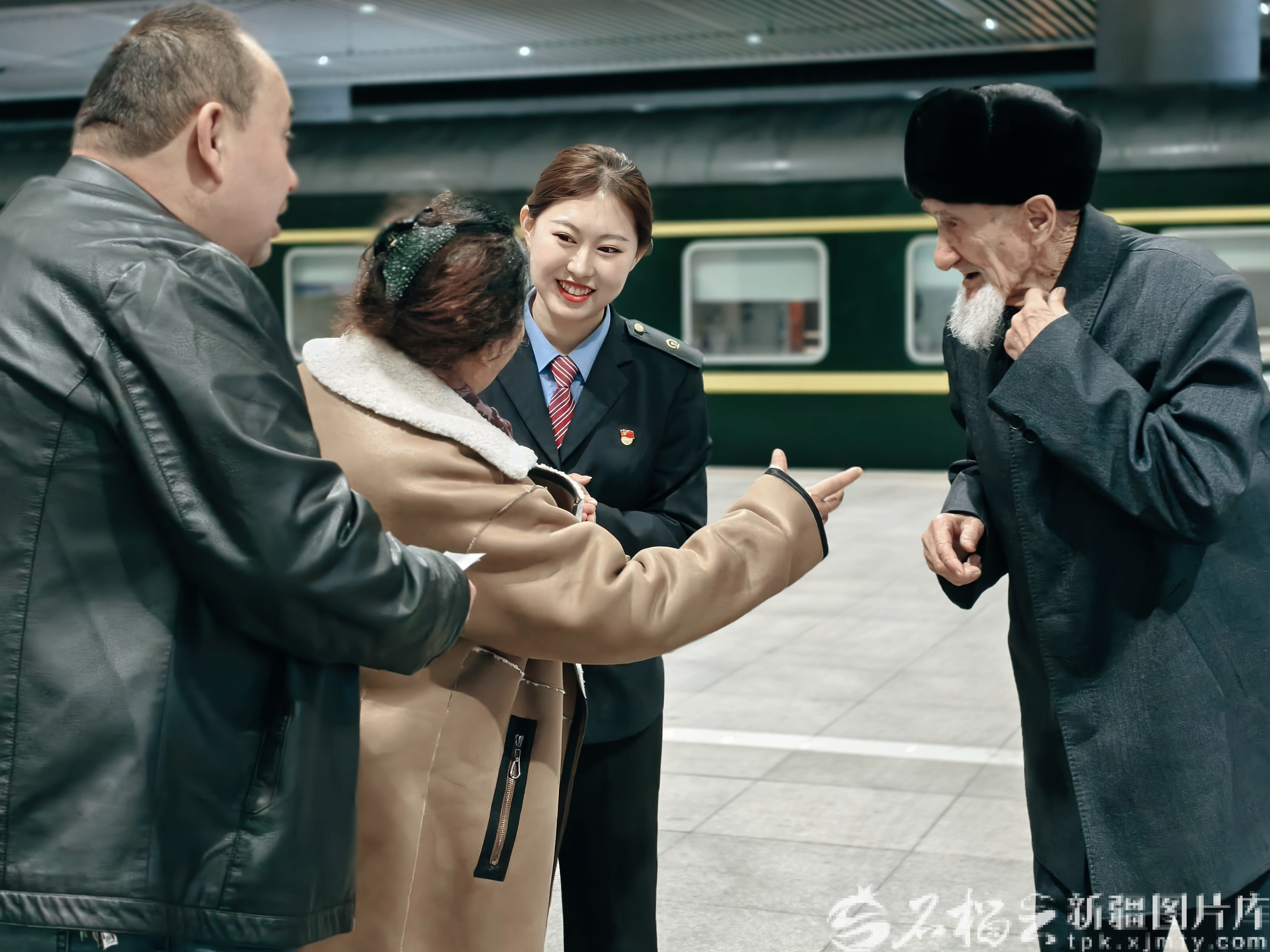3月18日,乌鲁木齐站客运车间工作人员在站台为旅客解答问询,贴心服务出行旅客。杨珂 摄