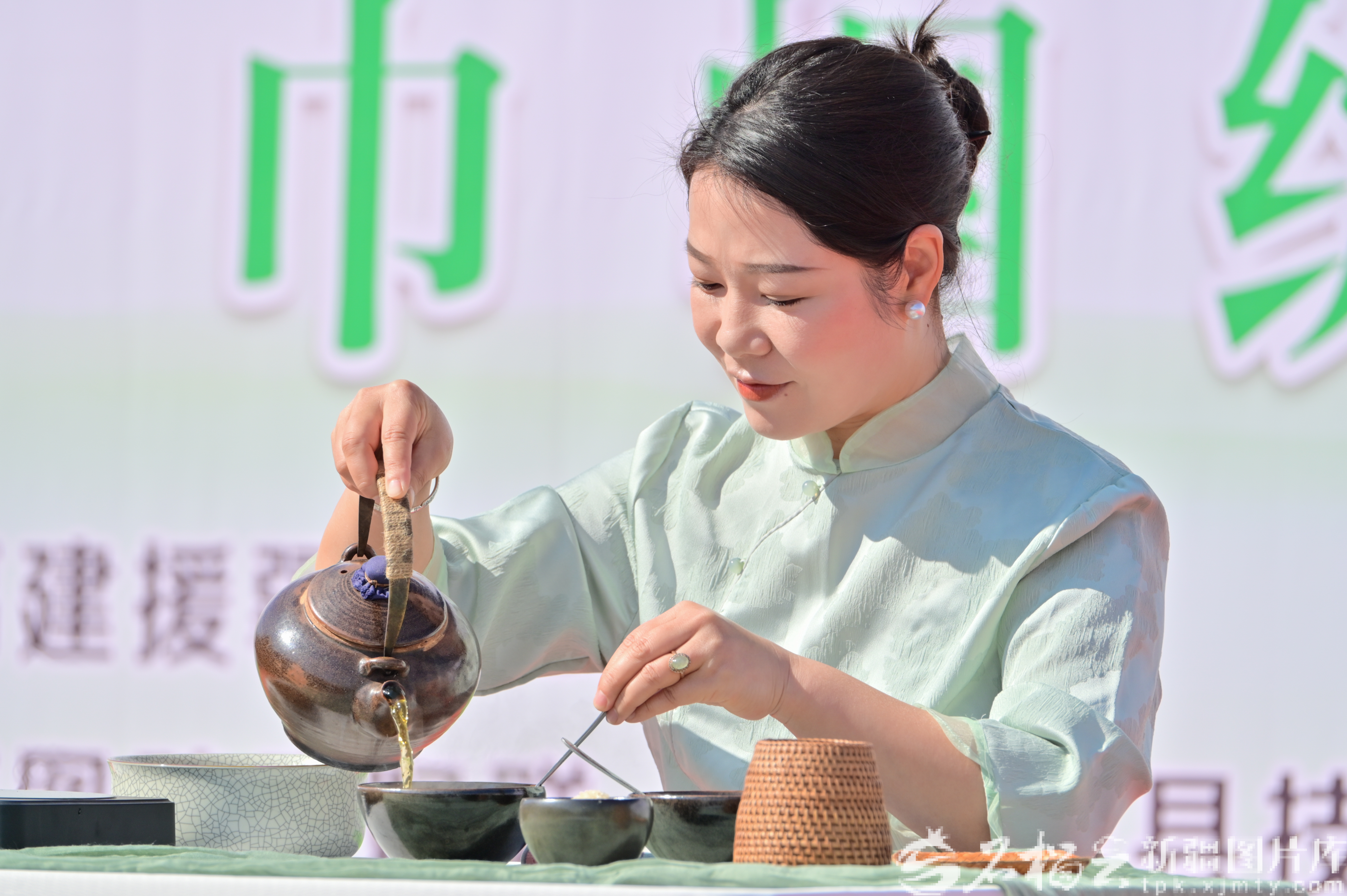 3月28日,呼图壁县“宁呼情深 茶香助梦”茶文化交流展演活动在锦华牛街举办。图为来自福建省宁德市屏南县的茶艺师为观众表演茶艺。陶维明 摄