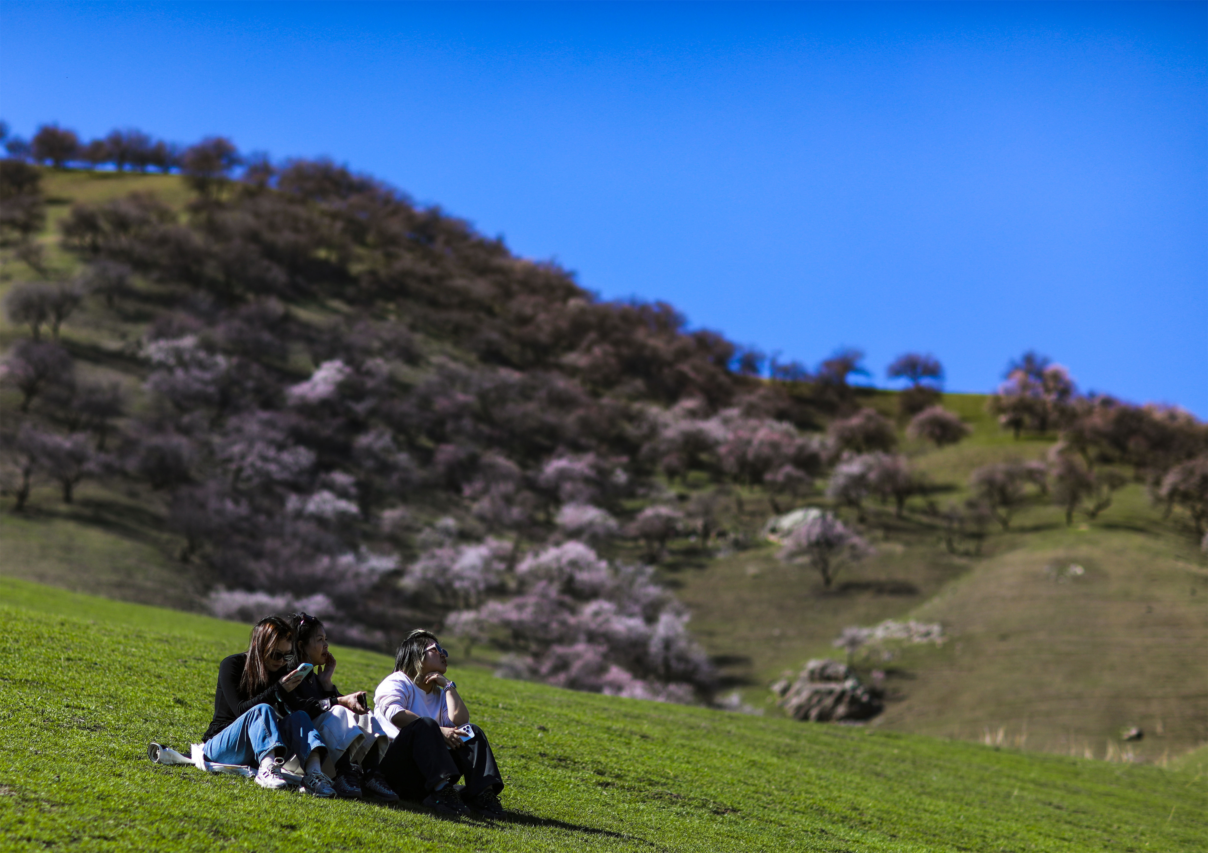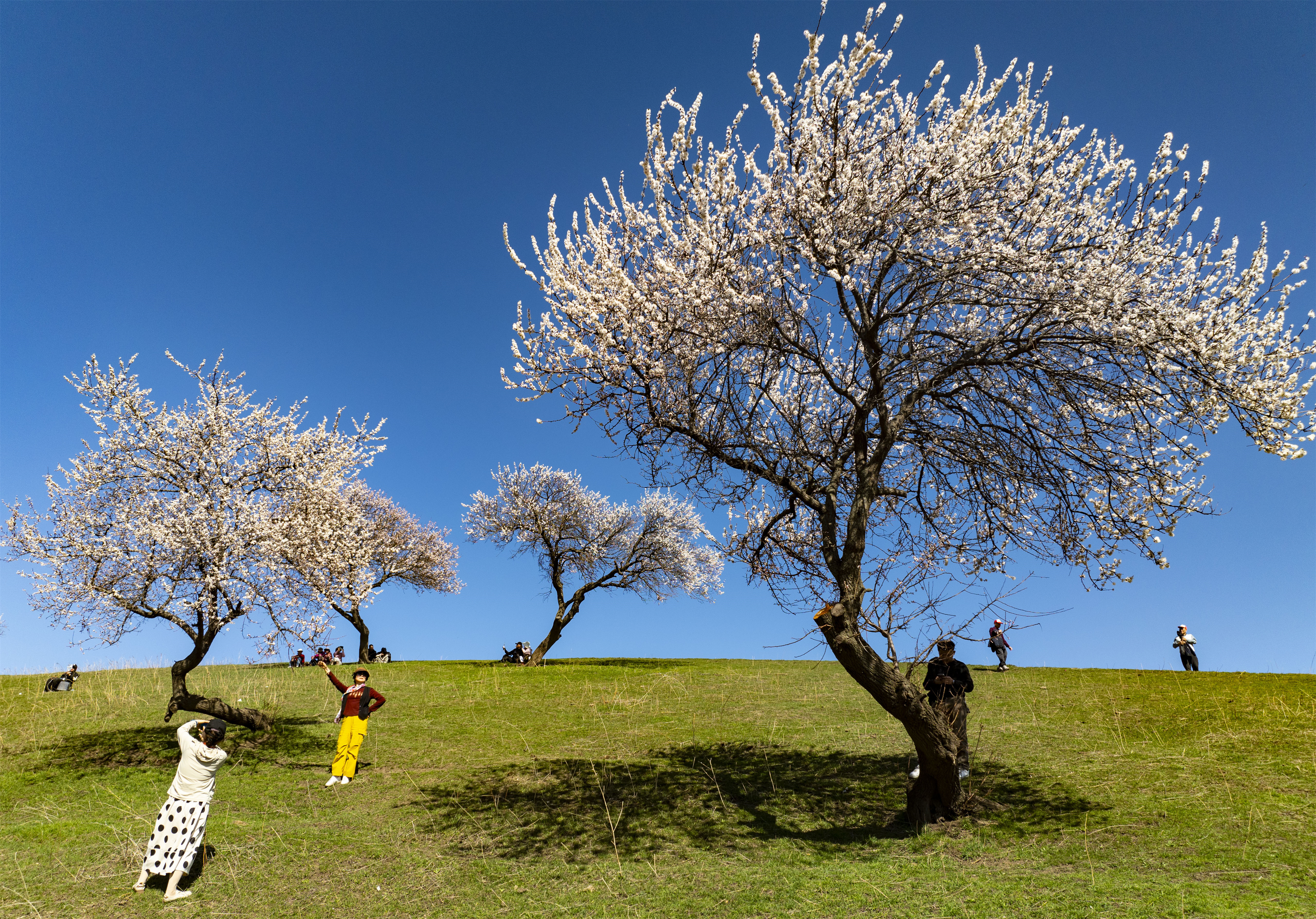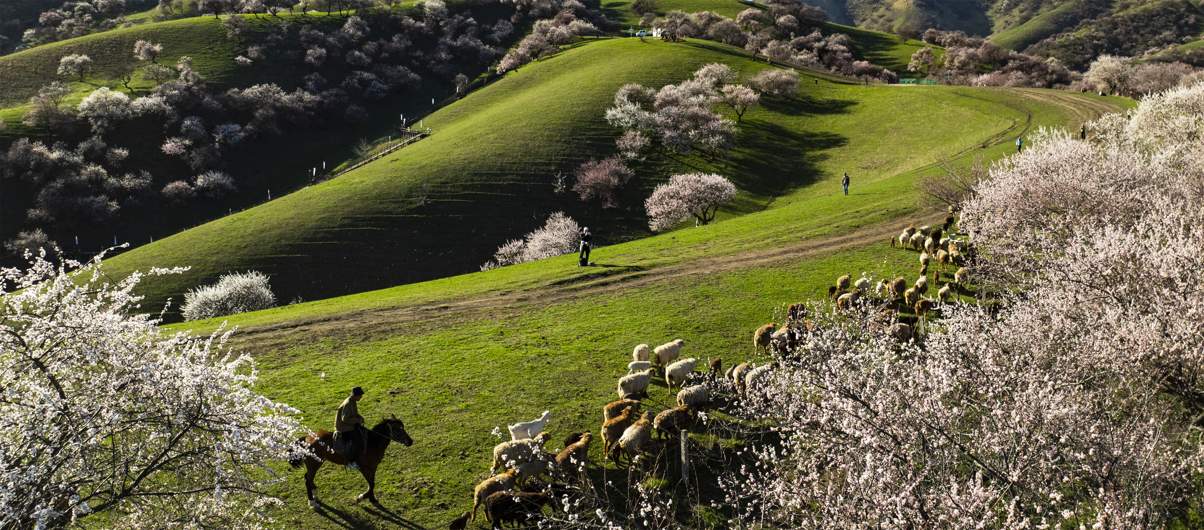 走进杏花谷,枝头杏花或含苞待放,或肆意盛开,淡雅的花香弥漫在空气中。成群的牛羊悠闲地在花海间穿行、觅食,与烂漫杏花相映成趣,尽显原生态的草原春日风情。树下,游客们漫步花间,驻足拍照,用镜头定格这份春日美好,欢声笑语回荡在山谷之中。
